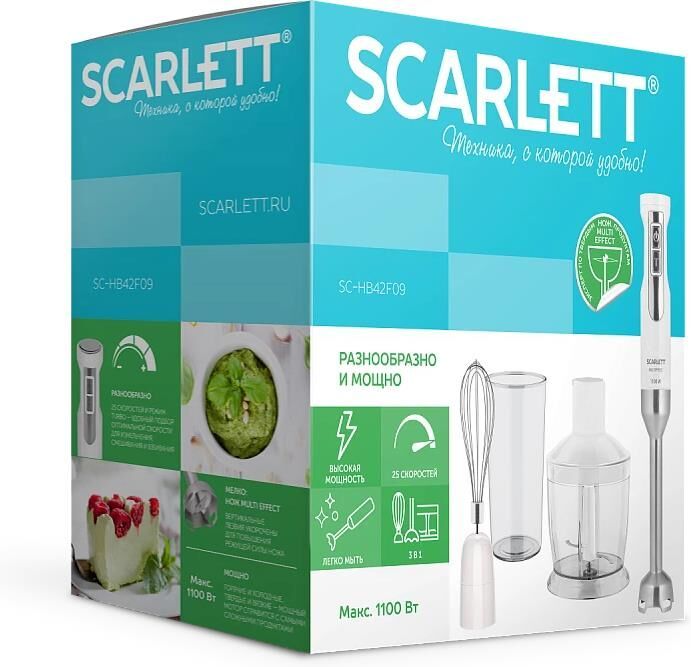 Тип: Погружной Мощность, Вт: 1100 Плавная регулировка скорости: Да Количество скоростных режимов: 25 Режим TURBO: Да Защита от перегрузки: Да Мини-измельчитель: Да Емкость мини-измельчителя, л: 0.6 Венчик для взбивания: Да Мерный стакан: Да Мерный стакан, л: 0.6 Насадка-блендер: Да Материал погружной части насадки-блендера: Нержавеющая сталь STEEL PRO Тип ножа: MULTIEFFECT Мойка в посудомоечной машине: Мерный стакан, венчик (металлическая часть), мини-измельчитель без крышки Длина электрошнура, м: 1.1 Цвет: Белый Погружной блендер Scarlett SC-HB42F09 - универсальный кухонный прибор. В комплекте идут насадки для смешивания, измельчения, взбивания, а также мерный стакан. Прибор имеет 25 скоростей, а также Turbo режим выбирайте идеальный режим работы для каждой кулинарной задачи. Нога блендера изготовлена из прочной нержавеющей стали собственной марки STEEL PRO, что гарантирует долговечность прибора.