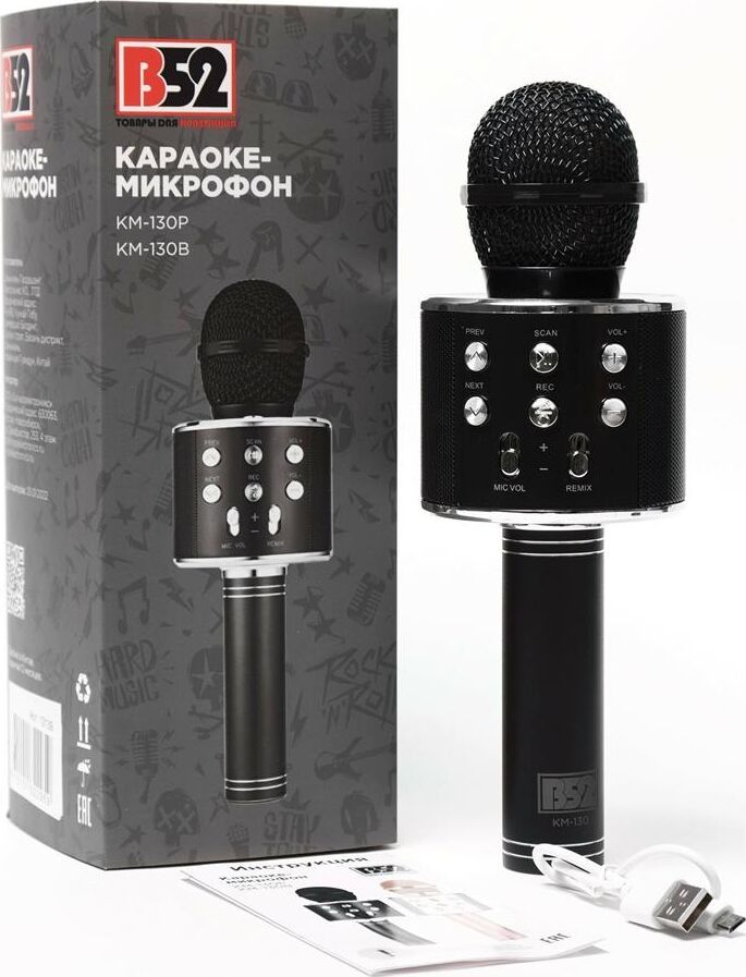 Караоке-микрофон В52-130B быстро и без проблем соединяется со смартфоном или планшетом через Bluetooth на расстоянии до 10м. Емкость батареи 800 мА/ч позволяет работать караоке-микрофону непрерывно на протяжении 2-3 часов без подзарядки. Караоке-микрофон имеет широкий частотный диапазон от 100 Гц до 20 000 Гц, что оптимально подходит для вокала. Караоке-микрофоном можно пользоваться даже в холодную погоду до -10 градусов. Караоке-микрофон B52-130P имеет мощность 3Вт, максимальная громкость составляет 115Дб, потребляемая мощность менее 8Вт. Имеются разъемы под наушники/AUX, питания micro USB, USB, microSD. Присутствует возможность регулировки громкости голоса и динамиков, воспроизведения/переключения музыкальных композиций. В комплектацию входит сам караоке-микрофон, инструкция на русском языке и USB-кабель. Товар сертифицирован.