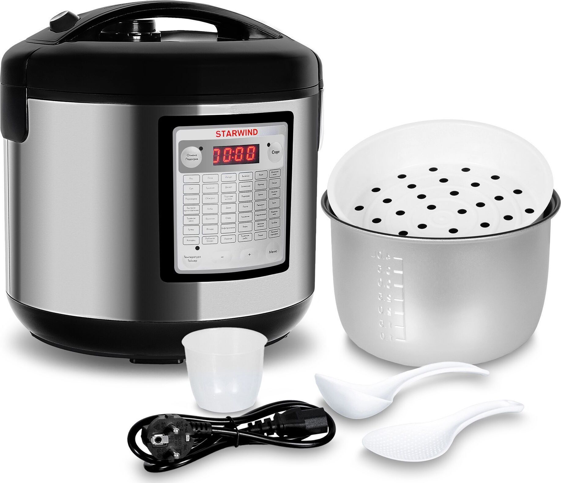 Тип управленияэлектронное Мощность700Вт Объем чаши5л Антипригарное покрытиеДА Покрытие чашиантипригарное Рабочий объем чаши4л РазогревДА Поддержание температурыДА Таймер отсрочки стартаДА Количество автоматических программ42 Материал корпусапластик/металл Цвет мультиваркисеребристый/черный Возможность изменение времени приготовления блюдДА Градуировка чашиДА Пароварка в комплектеДА Габариты упаковки (ед) ДхШхВ0.29x0.29x0.3м Срок гарантии12 мес.