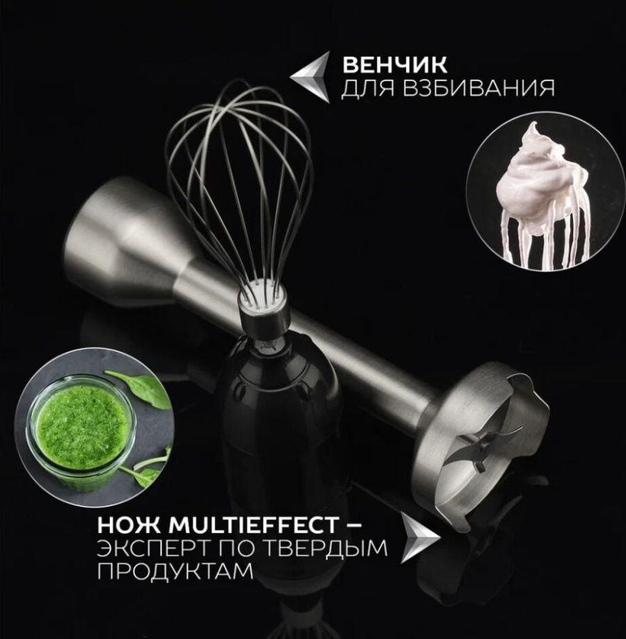Тип: Погружной Мощность, Вт: 1000 Режим TURBO: Да Мини-измельчитель: Да Емкость мини-измельчителя, л: 0.6 Венчик для взбивания: Да Мерный стакан: Да Мерный стакан, л: 0.6 Насадка-блендер: Да Материал погружной части насадки-блендера: Нержавеющая сталь STEEL PRO Скорость работы, об/мин: 15000 Производительность*, кг/мин *рубленное мясо в насадке мини-измельчителе : 0.25 Тип ножа: MULTIEFFECT Мойка в посудомоечной машине: Мерный стакан, мини-измельчитель без крышки, венчик (металлическая часть) Материал корпуса: Пластик Длина электрошнура, м: 1.1 Цвет: Черный