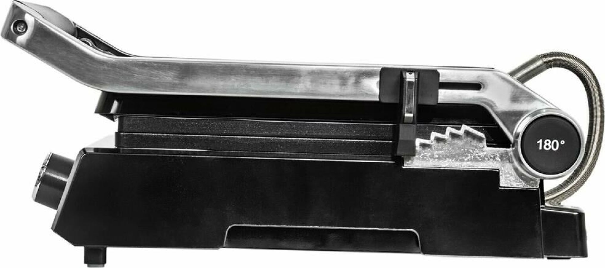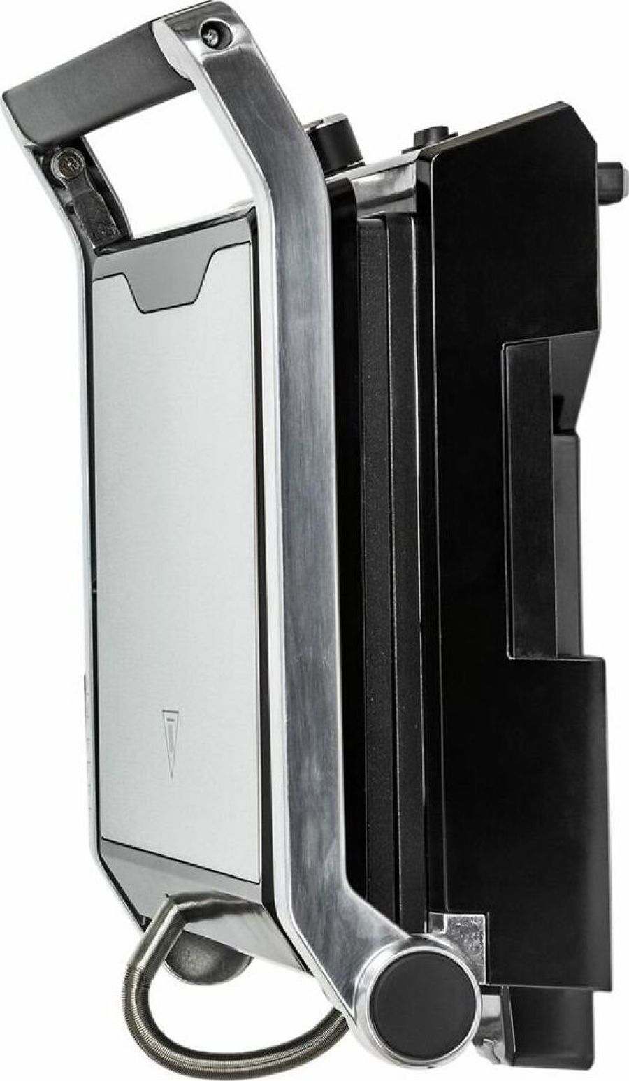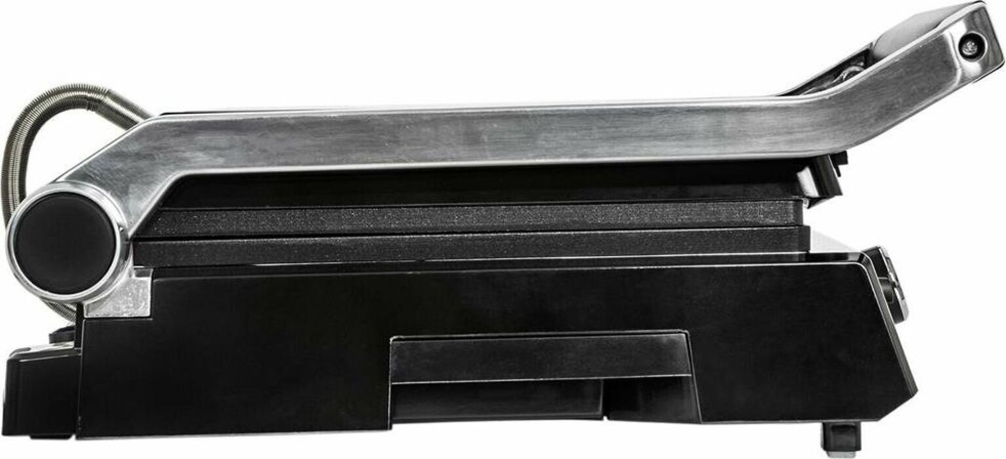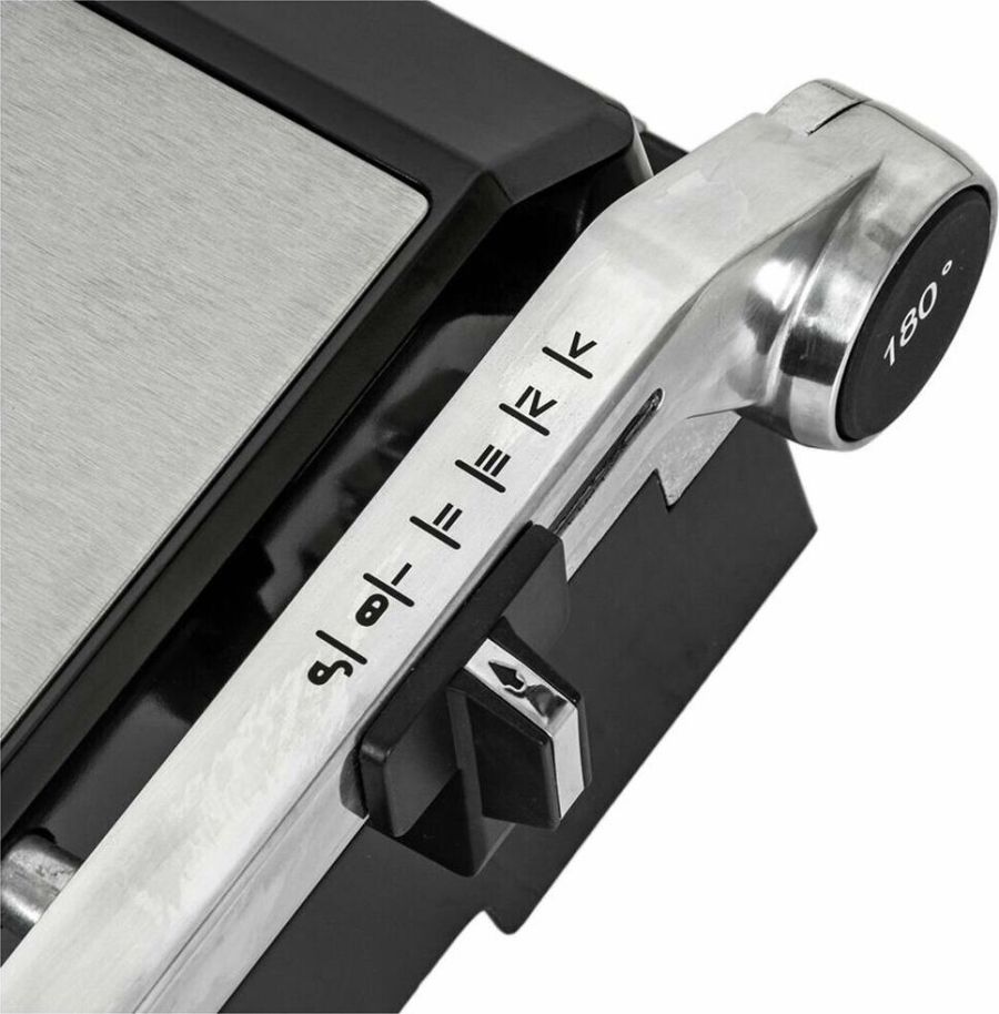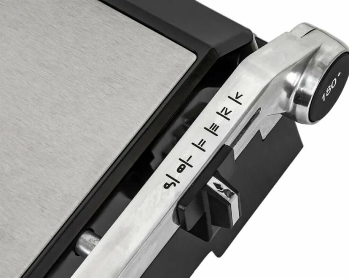 Гриль электрический, мощность 2000 Вт, корпус из матовой нержавеющей стали, плавающая крышка для регулировки толщины с 5 различными настройками высоты, съемные антипригарные панели, встроенный поддон для жира, регулятор температуры с индикатором, скребок в комплекте, панели можно мыть в посудомоечной машине