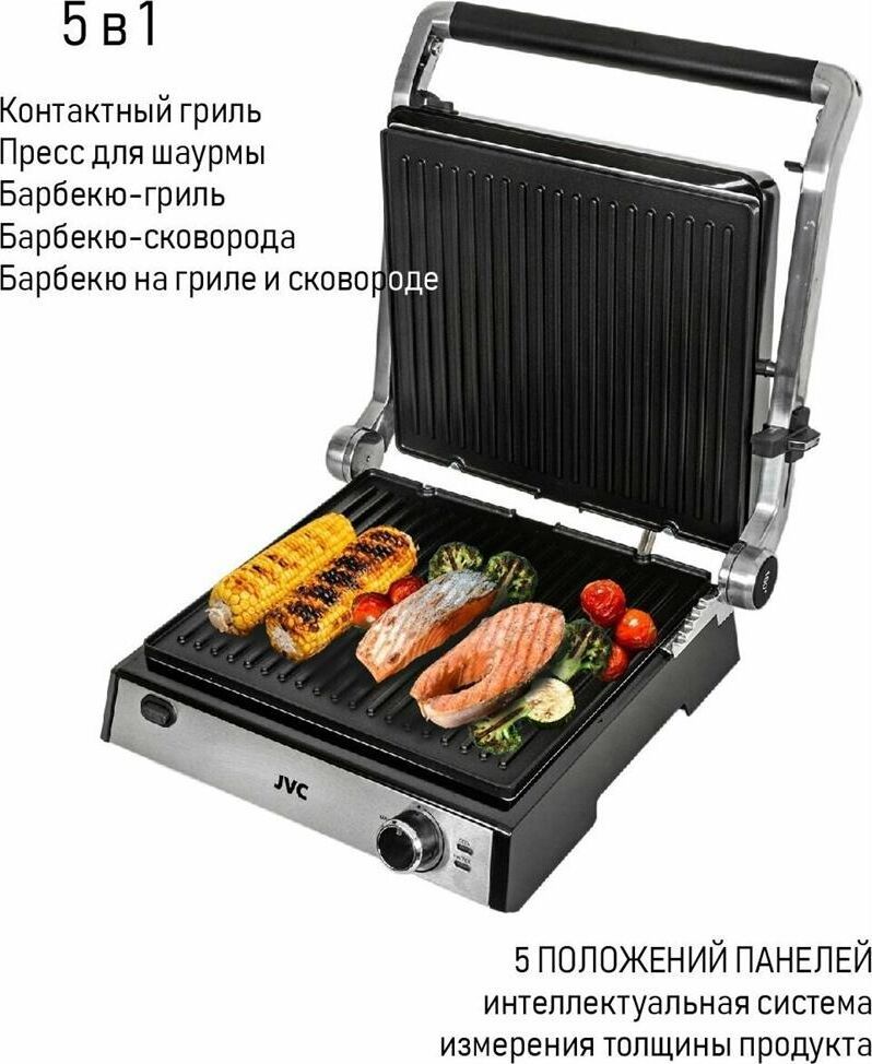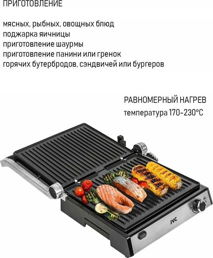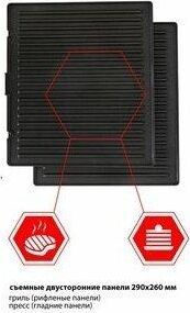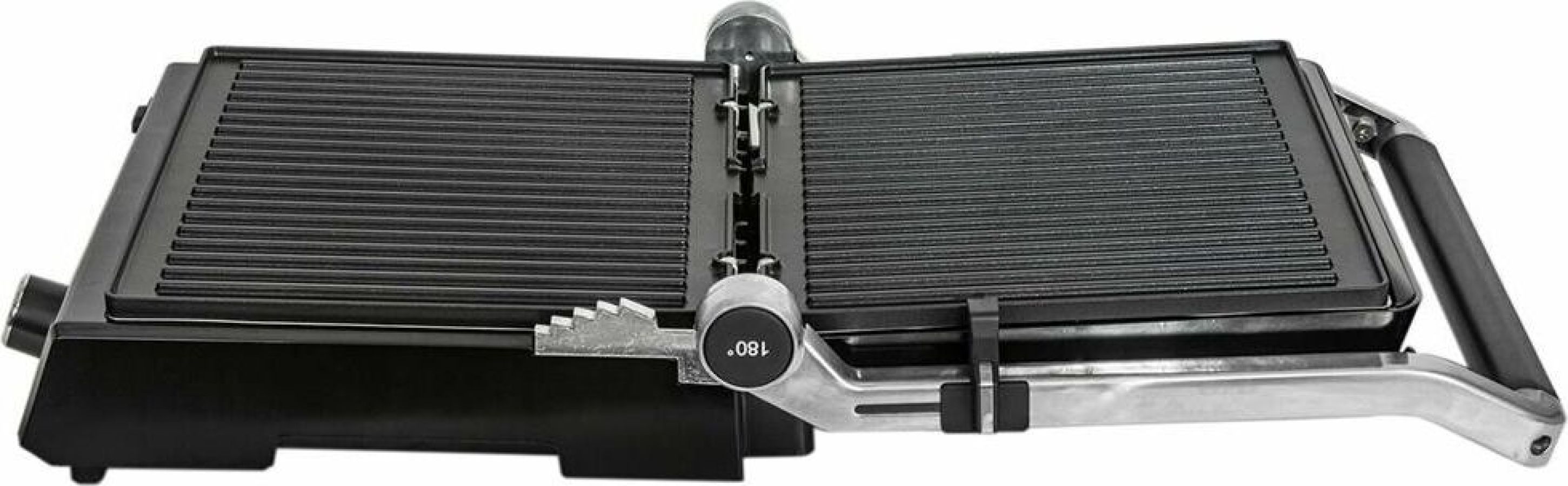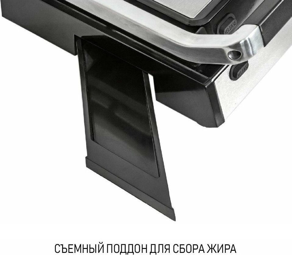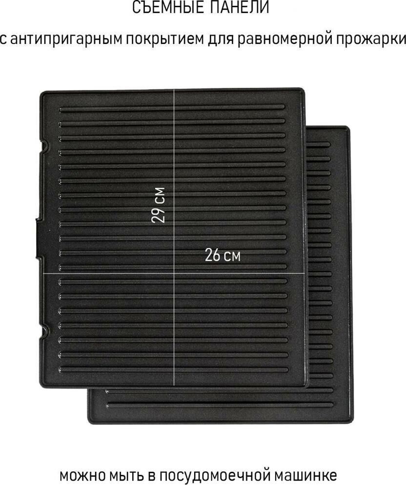 Гриль электрический, мощность 2000 Вт, корпус из матовой нержавеющей стали, плавающая крышка для регулировки толщины с 5 различными настройками высоты, съемные антипригарные панели, встроенный поддон для жира, регулятор температуры с индикатором, скребок в комплекте, панели можно мыть в посудомоечной машине