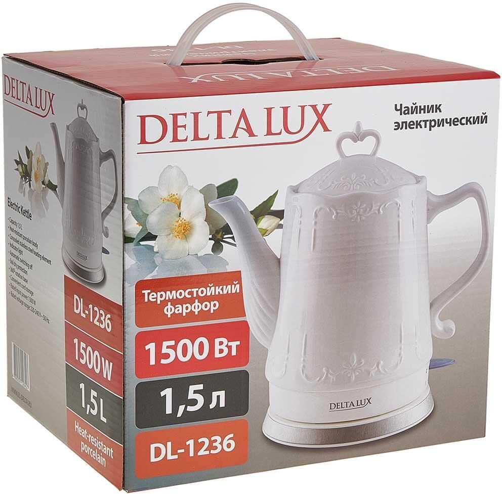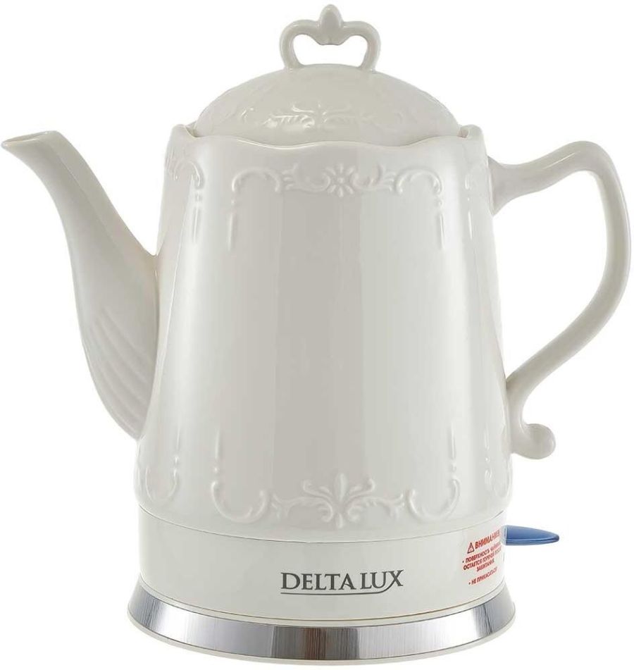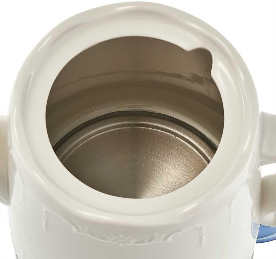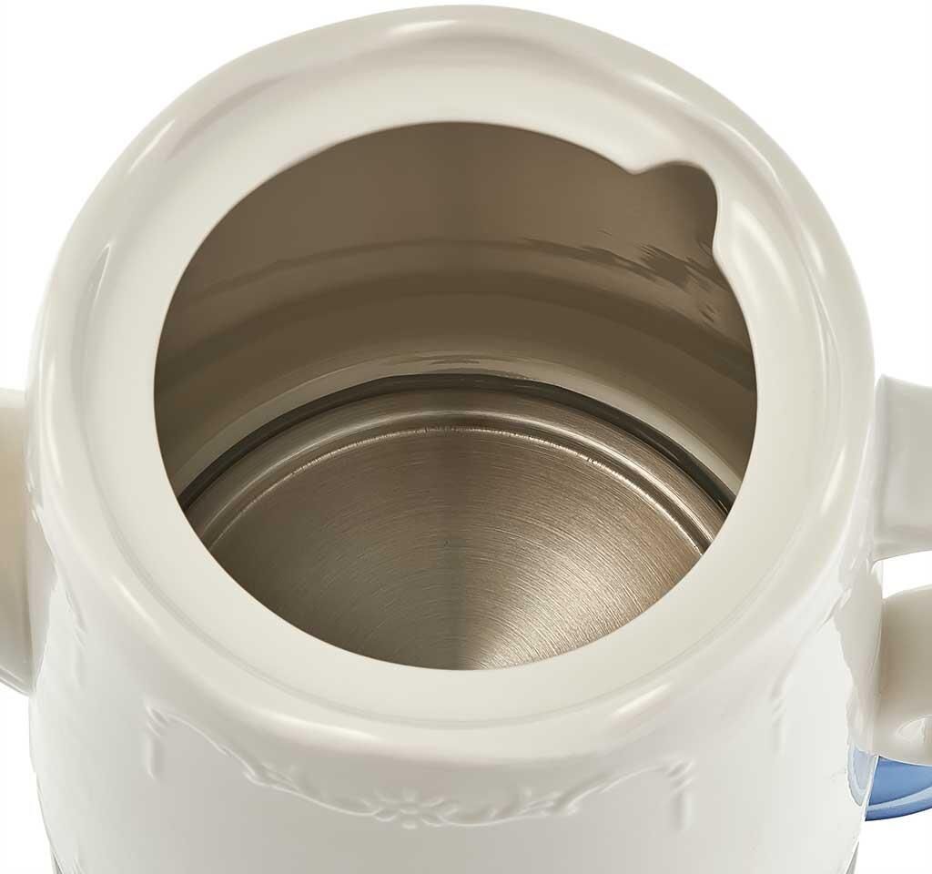 Объем 1,5 л Номинальная мощность 1500 Вт Корпус из термостойкого фарфора Закрытый нагревательный элемент Вращение корпуса на 360° Световой индикатор работы Удобное хранение электрошнура Многоуровневая защита: автоматическое отключение при закипании отключение при снятии чайника с базы отключение при недостаточном количестве воды