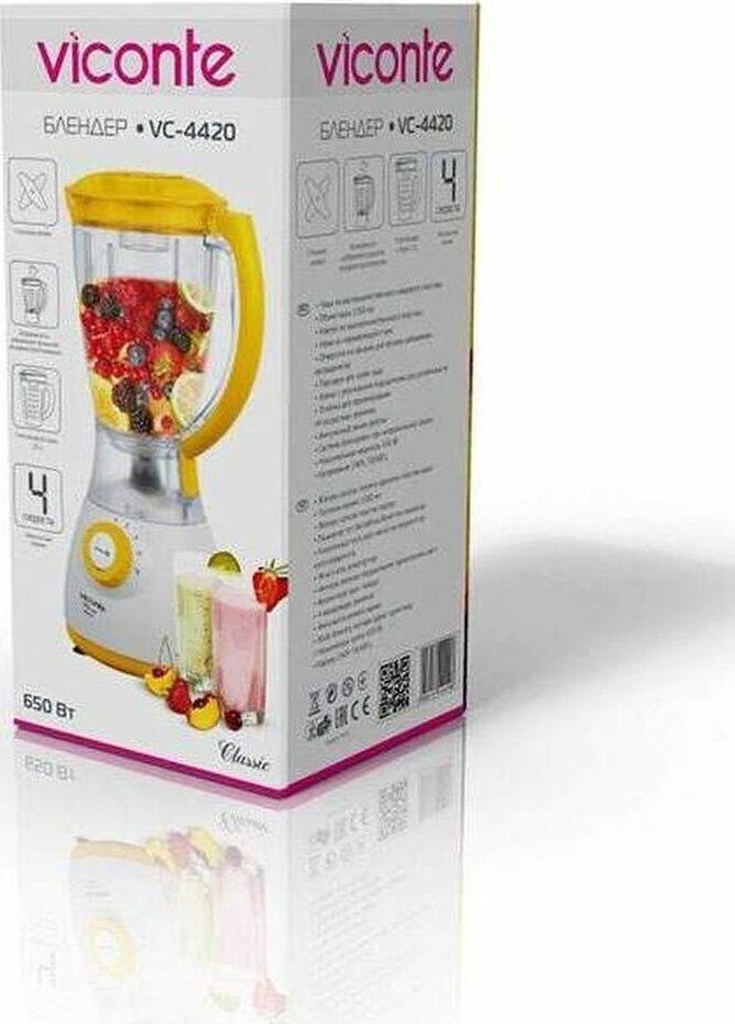 Блендер, мощность 650 W, чаша из высококачественного пищевого пластика - 1,5 литра, пульсовый режим работы, 4 скорости, лезвия из нержавеющей стали, автоматическая блокировка при неправильной сборке, ножки с резиновыми подушечками для устойчивости, палочка для перемешивания, отверстие на крышке для удобного добавления ингредиентов, удобство и простота в обращении и чистке.