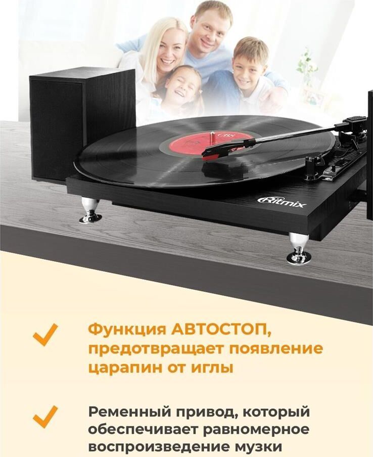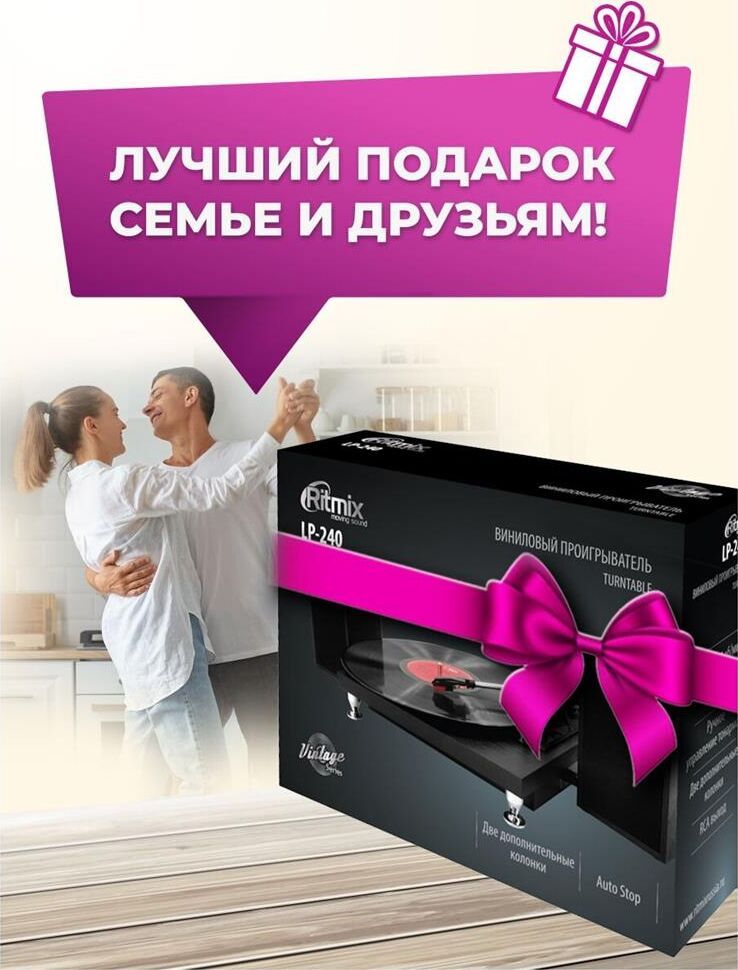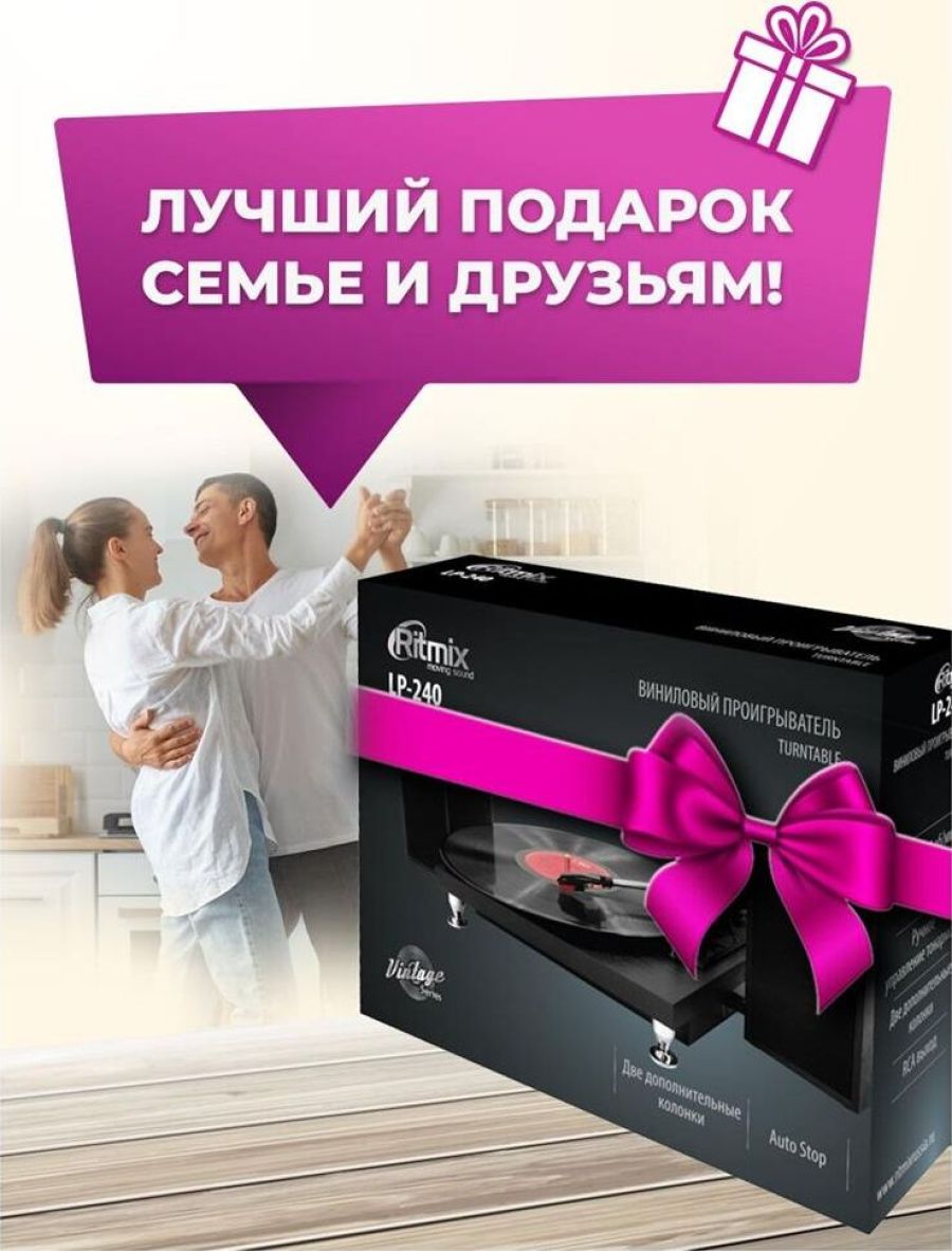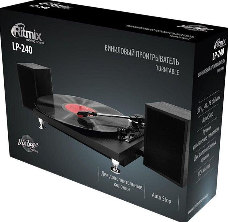 Комплектация: виниловый проигрыватель LP-240, стационарная колонка для LP-240 - 2 шт., адаптер для пластинок на 45 оборотов в минуту, инструкция пользователя, гарантийный талон