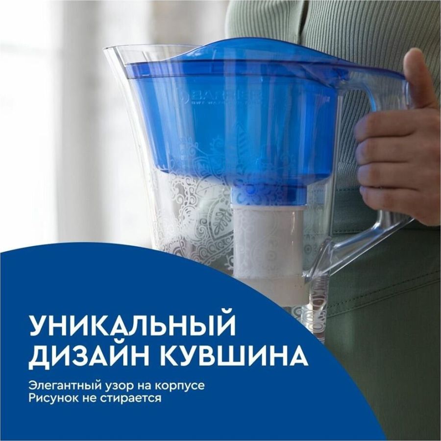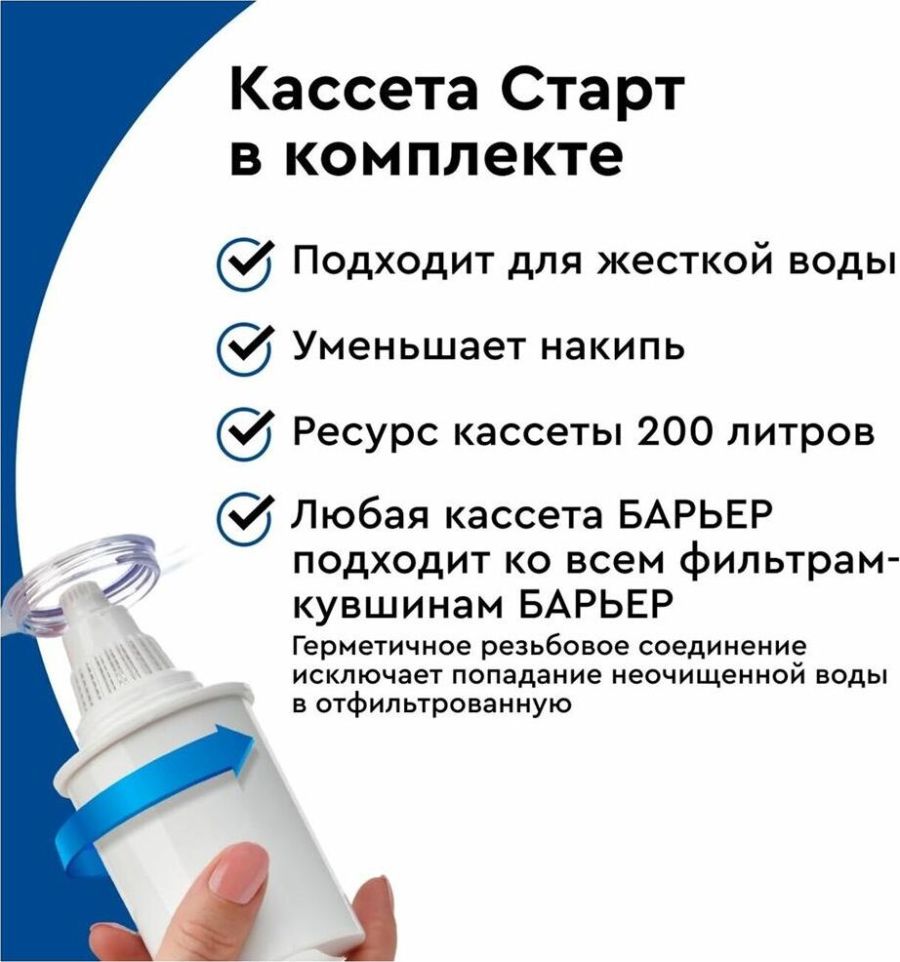 Яркий компактный кувшин с элегантным узором. Не занимает много места на кухне, удобно помещается в дверце холодильника. В комплекте кассета БАРЬЕР Старт. Кассета Старт – экономичная очистка водопроводной воды от хлора и других вредных примесей. Устраняет посторонние привкусы и запахи. Препятствует образованию накипи в чайнике. Одна кассета БАРЬЕР способна заменить несколько сотен пластиковых бутылок. По окончании ресурса кассету можно сдать на переработку.