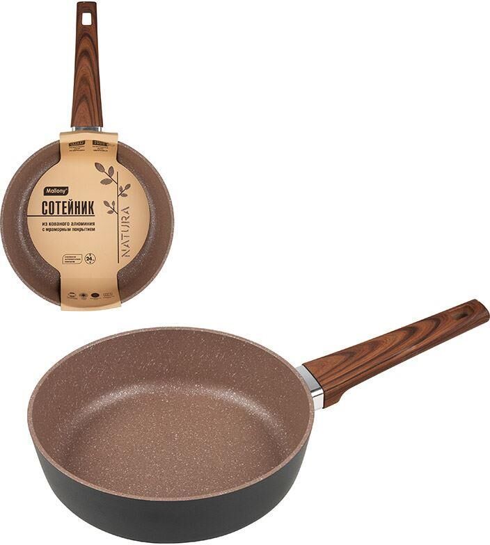 Кованая алюминиевая сковорода Диаметр: 24 см Толщина дна/стенок: 3,7/2.8 мм Высота стенок: 68 мм Бакелитовая рукоятка (дизайн под дерево) с покрытием soft touch Внутри двухслойное антипригарное мраморное покрытие (Pfluon), снаружи матовое черное антипригарное покрытие Усиленное крепление рукоятки Материалы: алюминий, пластмасса, ТПР, элементы из нержавеющей стали Лого на дне Подходит для всех типов плит, включая индукционные