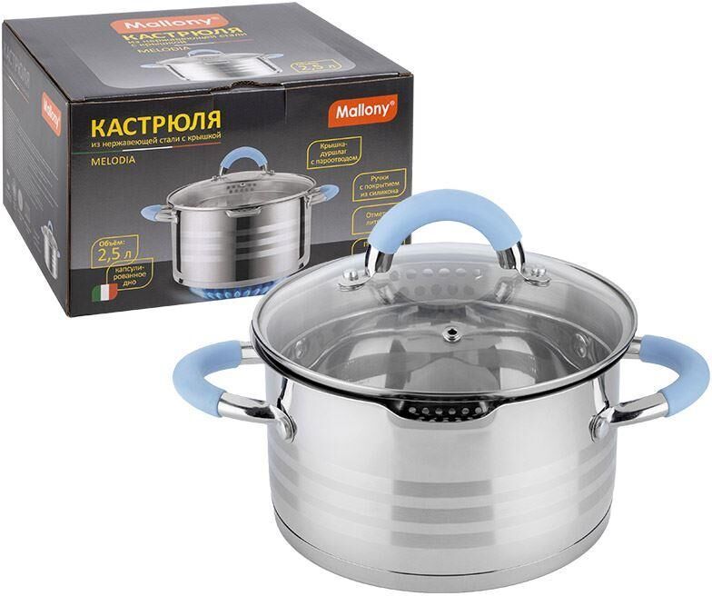 Кастрюля 2,5 л, MELODIA, из нержавеющей стали, с крышкой-дуршлагом и 2-мя носиками для слива. Размер: 18*10 см. Объем: 2,5 л. Нерж сталь, толщина стали: 0,5 мм. 5-слойное капсулированное дно, подходит для всех типов плит. (0,5 мм алюминий+1 мм железо + 0,5 мм алюминий + сталь база). Снаружи: смешанный дизайн. Внутри: зеркальная полировка + отметки литража. Крышка-дуршлаг из жаропрочного стекла с отверстиями разного диаметра 3 и 6 мм с двух сторон + отверстие для выпуска пара в стекл части. Толщина стекла: 3,8 мм.Ручки: стальные полые с покрытием из силикона. Цветная коробка. Толщина дна: 2,9 мм.