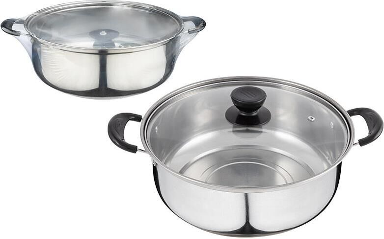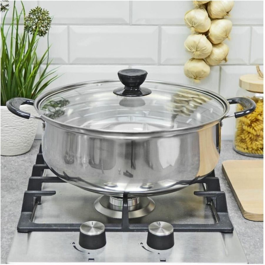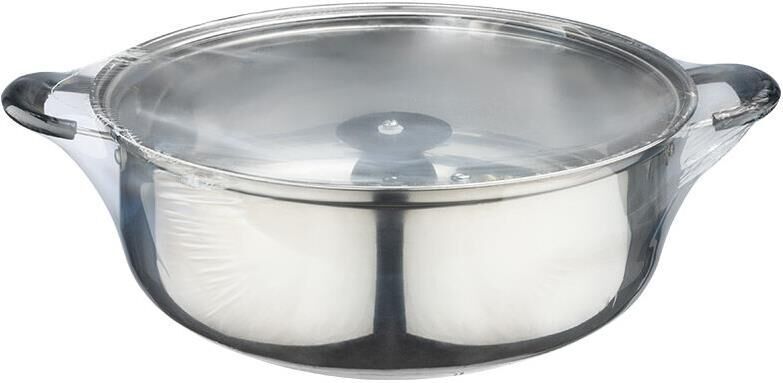 Кастрюля Promo, объем 5,5 л, из нержавеющей стали с крышкой из жаропрочного стекла Материал: нерж сталь, жаропрочное стекло, нейлон. Толщина стенок 0,3 мм, объем 5,5 л. Размер: 29,5 (диаметр) *12 (высота без крышки) см. Размер с ручками: 38 см. Высота с крышкой: 16,5 см. Дно однослойное. Подходит для всех типов плит. Не рекомендуется мыть в посудомоечной машине. Зеркальная полировка корпуса внутри и снаружи. Отметки литража. Крышка из жаропрочного стекла С-типа с отверстием для выпуска пара. Ручки: нерж сталь+ нейлон. Упаковка: стикер+термоусадочная пленка.