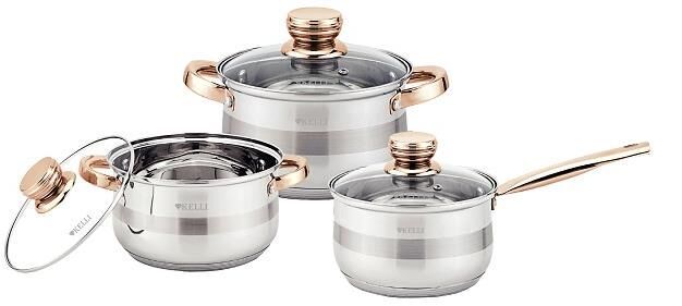 Набор посуды 6 предметов Ковшик с крышкой 1,2л Диаметр: 14см Кастрюля с крышкой 2л Диаметр: 16см Кастрюля с крышкой 2,7л Диаметр: 18см Высококачественная нержавеющая сталь Стеклянные крышки с паровыпуском 5-ти слойное капсульное дно Клепанные ручки не нагреваются