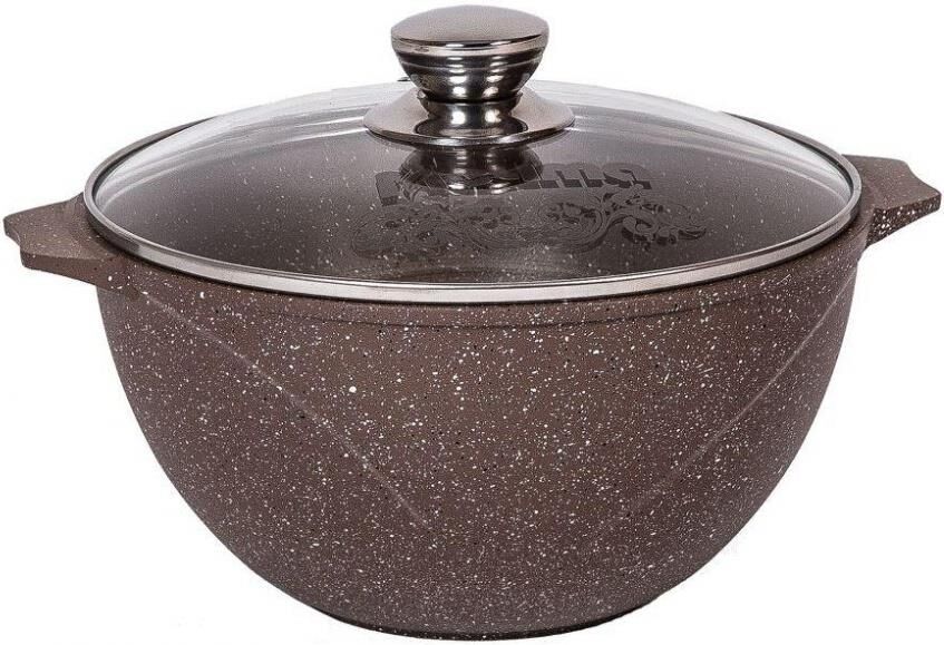 Казан для плова 5л. со стеклянной крышкой. Антипригарное покрытие Greblon Rough на водной основе без PFOA. Серия "Гранит brown". Подходит для всех типов плит, кроме индукционных. Можно использовать в посудомоечной машине. Ресурс более 15 000 циклов, толщина покрытия до 55 мкр. Толщина дна 5,5-6мм., толщина стенок 3,6-4мм. Покрытие Greblon Rough позволяет готовить с минимальным количеством масла, сохраняя вкусовые и полезные свойства продуктов. Литой толстостенный корпус не подвержен деформации, а утолщенное дно равномерно распределяет тепло по всей поверхности.