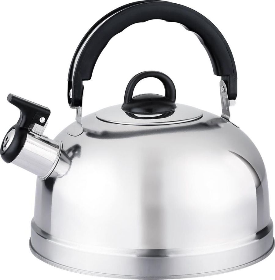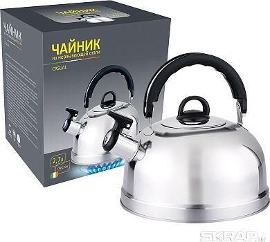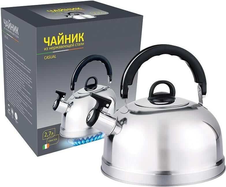 Чайник из нерж стали со свистком Casual, зеркальная полировка, литраж - 2,7 л, без тм Толщина стали - 0,25 мм Материалы - нерж сталь, пластик. Дно - однослойное. Подходит для всех типов плит. Упаковка - цветная коробка.