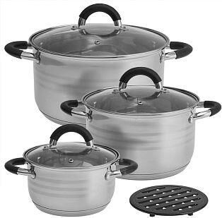 Параметры В наборе: кастрюля со стеклянной крышкой 16х9,5см; 1,9л кастрюля со стеклянной крышкой 20х12,5см; 3,8л кастрюля со стеклянной крышкой 24х13,5см; 5,8л подставка Ø16,5 см 1 штука Толщина стали 0,4 мм Описание Набор кастрюль из высококачественной нержавеющей стали со стеклянными крышками, с подставкой под горячее Серия: Master Специальная форма, исключающая скопление остатков пищи и жира Обод, препятствующий переливанию жидкостей через край Подставка под горячее из бакелита Термостойкое силиконовое покрытие ручек Термосберегающее дно: пятислойное дно с повышенной термоотдачей Быстрый нагрев пищи, длительное удержание тепла Минимальные потери минеральных веществ, витаминов и вкусовых качеств Подходит для использования на всех типах кухонных плит, включая индукционные Подходит для мытья в посудомоечной машине