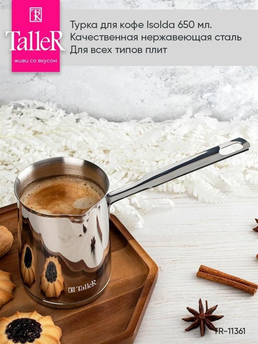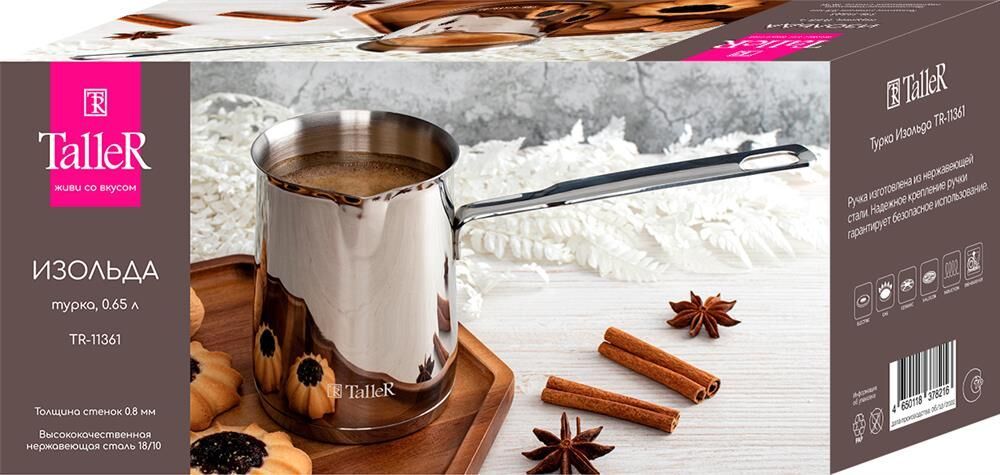 Турка 0,65 л Изольда Материал: нержавеющая сталь, толщина стенки 0,8 мм, толщина дна 4.0 мм Рекомендации: подходит для всех типов плит, влючая индукционные. Пригодна для мойки в посудомоечной машине Упаковка - цветная коробка