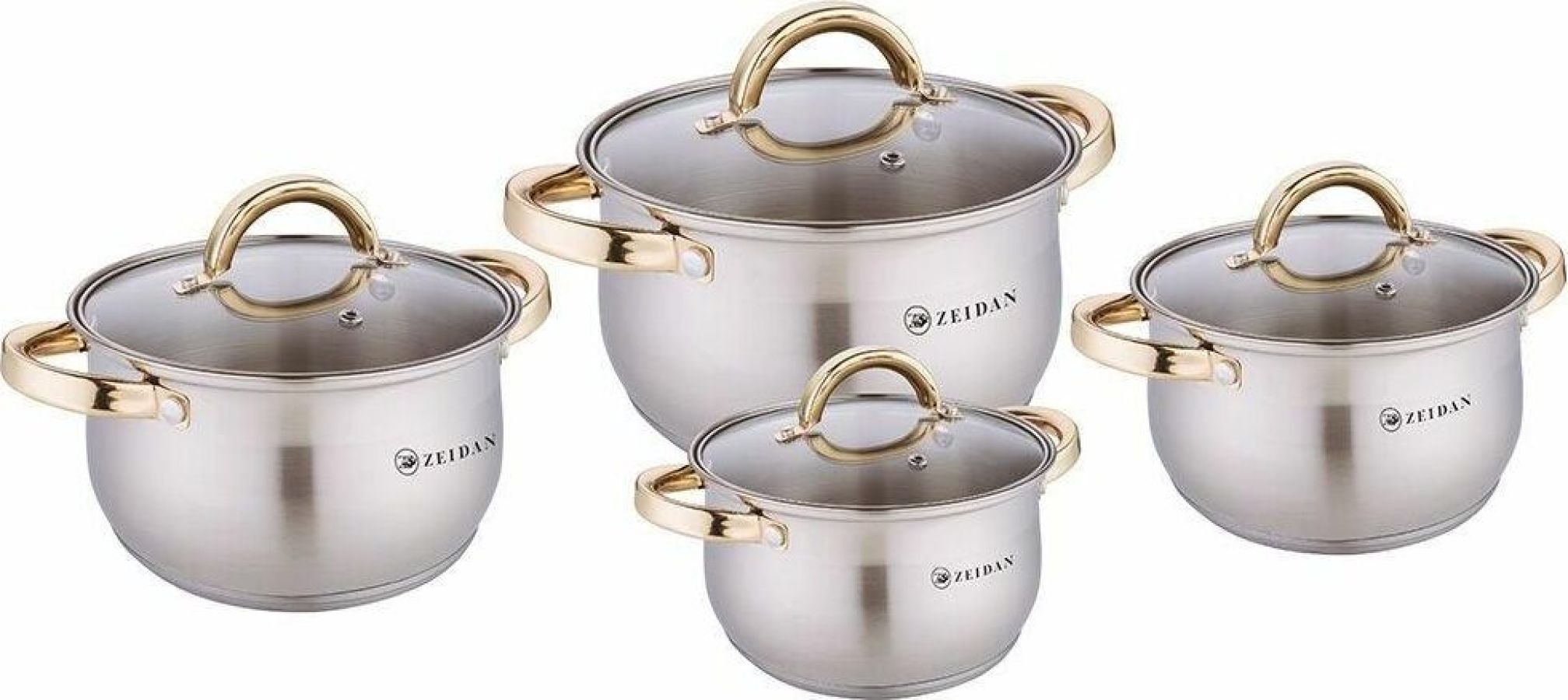 Набор посуды ZEIDAN Z-50821 8 предметов, Набор посуды, 8 предм. (4 КАСТРЮЛИ С КРЫШКАМИ: 4,0 Л (Ø20 см ), 5,1 Л (Ø22 см), 6,6 Л (Ø24 см ), 8,2 Л (Ø26 см ), нержавеющая сталь, 5-ти СТЕПОВОЕ КАПСУЛИРОВАННОЕ ИНДУКЦИОННОЕ ДНО, крышки - стекло, ручки на корпусе и крышке "ПОД ЗОЛОТО", комбинированная полировка снаружи, матовая полировка внутри. Подарочная упаковка.