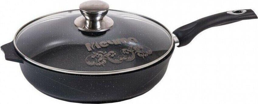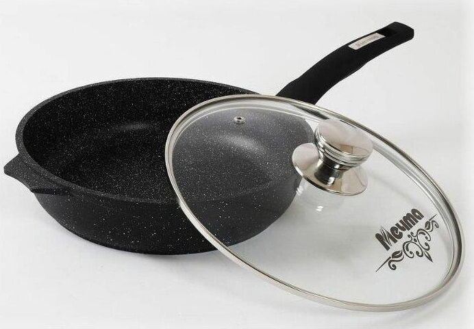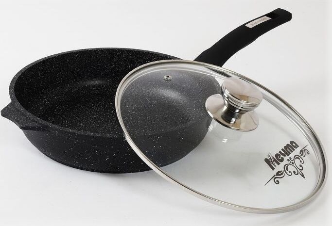 Сковорода 30см с антипригарным покрытием, несъемной ручкой и стеклянной крышкой серии "Гранит black". Подходит для всех типов плит, кроме индукционных. Можно использовать в посудомоечной машине.