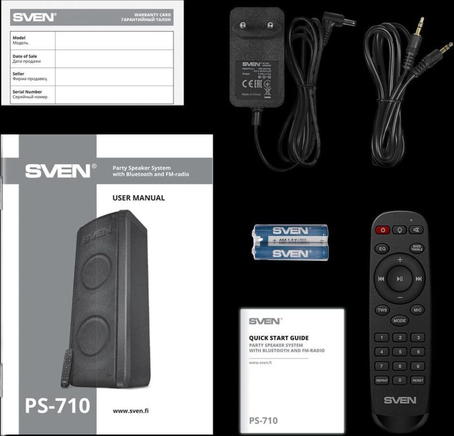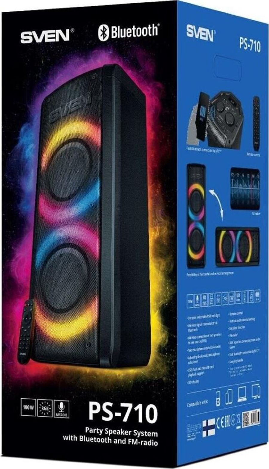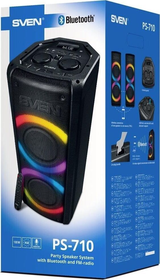 Выходная мощность (RMS), Вт 100 (2 × 50) Частотный диапазон, Гц 40 – 22 000 Диапазон частот тюнера, МГц 87.5 – 108 Размеры динамиков, мм ВЧ: Ø 38, НЧ: Ø 145 Беспроводная передача сигнала по Bluetooth да Воспроизведение музыки с носителей памяти USB, microSD Источник питания Литий-ионный aккумулятор: 7.4В, 4400мА*ч (32.56Вт*ч) DC 9 V Номинальный ток потребления, А 0,05 Тип соединения Bluetooth, проводной Радиус действия, м до 10 Динамическая отключаемая RGB подсветка Передача сигнала по Bluetooth Беспроводное подключение двух колонок к одному источнику звука (TWS) Два микрофонных входа для караоке Регулировка уровня эха караоке микрофона Воспроизведение музыки с USB flash и microSD карт памяти LED дисплей Пульт ДУ Функция эквалайзера FM-радио* Вход AUX для подключения источника звука Быстрое подключение по Bluetooth с помощью NFC** Ручка для переноски Встроенный Li-Ion аккумулятор