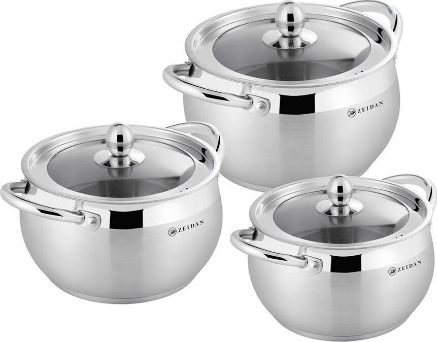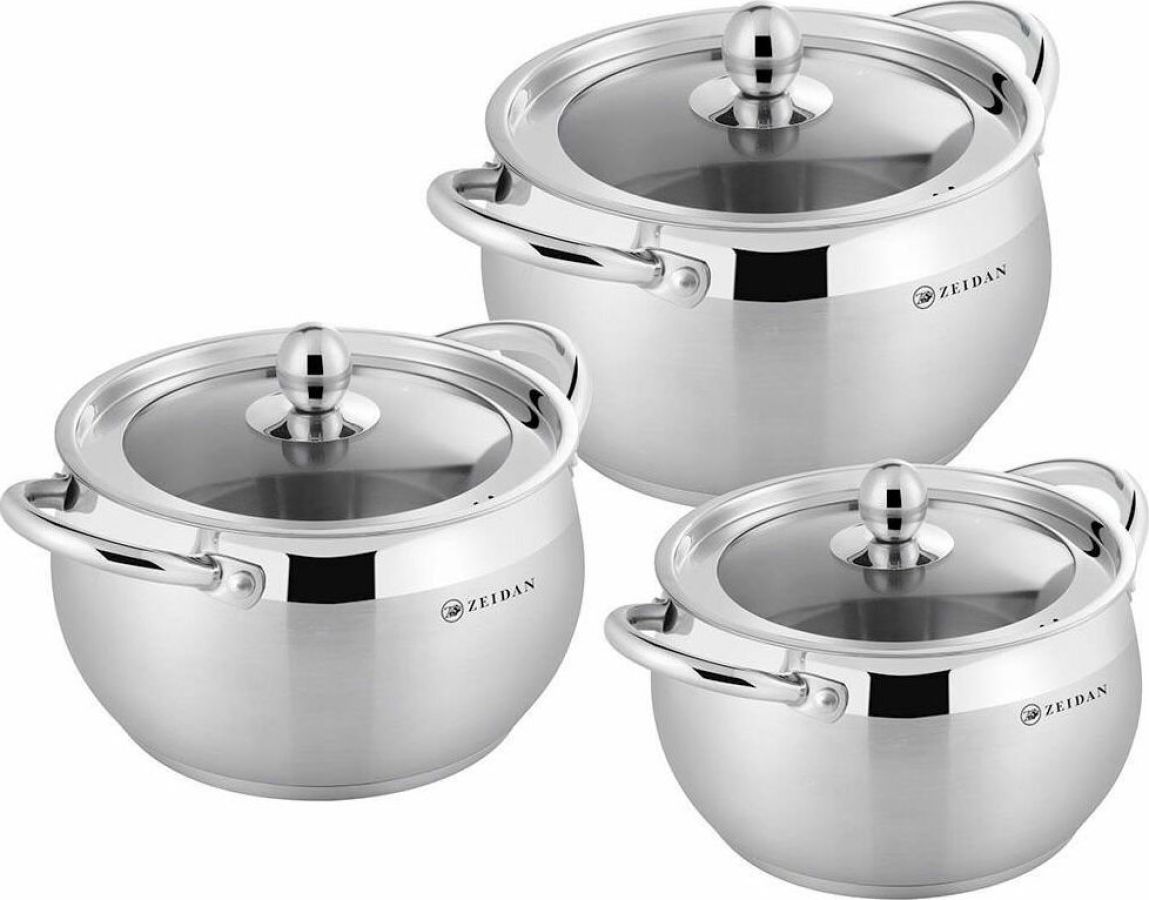 Набор посуды ZEIDAN Z-50662 6 предметов , Набор кастрюль, 6 предм. (3 КАСТРЮЛИ С КРЫШКАМИ: 2,0 Л (d16 см ), 3,0 Л (d18 см ), 4,0Л (d20 см ), нержавеющая сталь, 3-Х СЛОЙНОЕ КАПСУЛИРОВАННОЕ ИНДУКЦИОННОЕ ДНО, крышки - стекло, ручки на корпусе и крышке в цвет корпуса, комбинированная полировка снаружи, матовая полировка внутри. Подарочная упаковка.