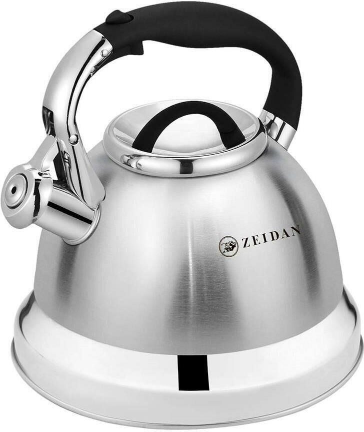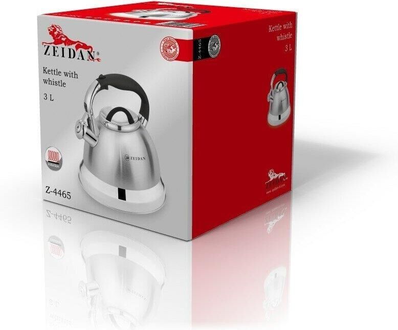Чайник со свистком ZEIDAN Z-4465 3,0 л , Чайник со свистком, 3,0 л, нержавеющая сталь, капсулированное индукционное дно, курковый механизм, комбинированная полировка корпуса, фиксированная комбинированная ручка. Подарочная упаковка.