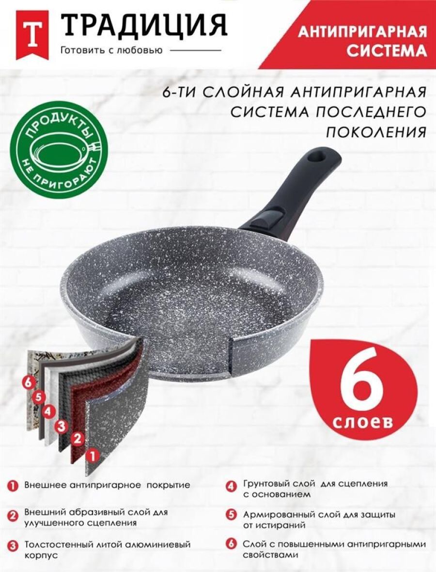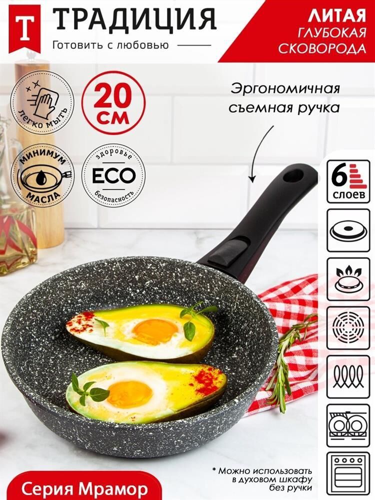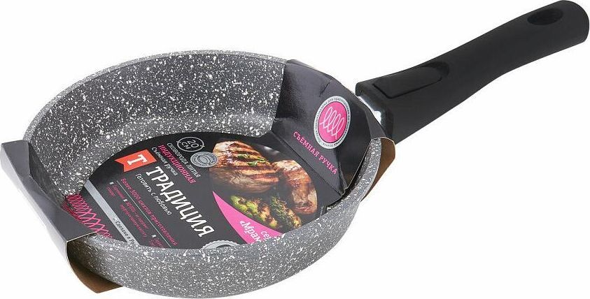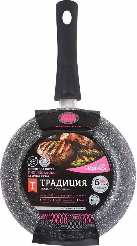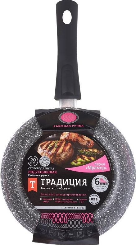 Сковорода 20 см Мрамор. Материал: пищевой литой алюминий. Антипригарное мраморное покрытие. Подходит для всех тип плит, в том числе индукционных. Имеет съемную ручку, легко чистится. Можно мыть в посудомоечной машине. Без крышки.