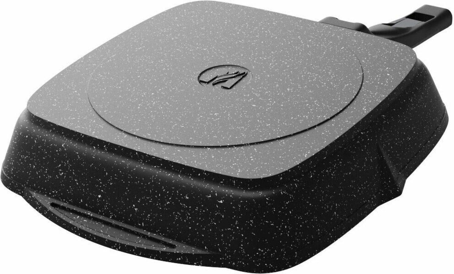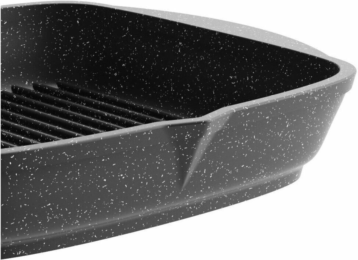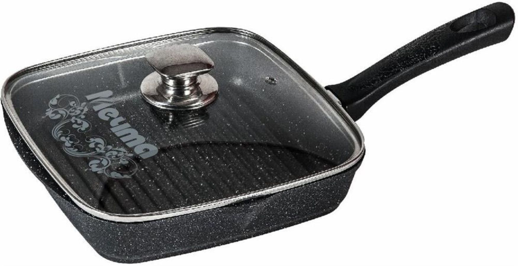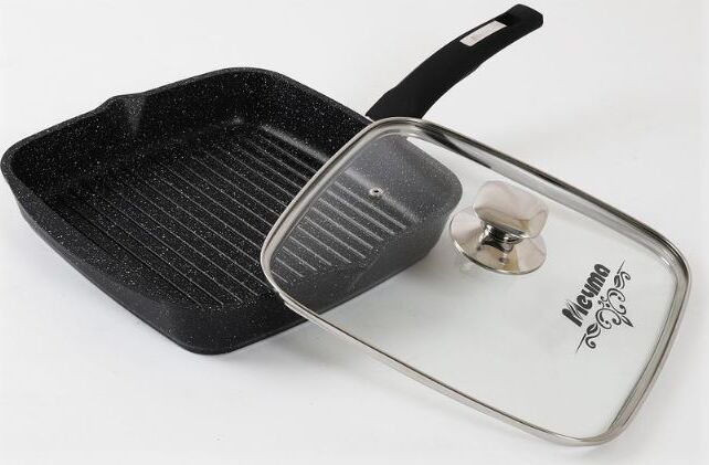 Сковорода-гриль квадр. 28*28 см с антипригарным покрытием, несъемной ручкой и стеклянной крышкой серии "Гранит black". Подходит для всех типов плит, кроме индукционных. Можно использовать в посудомоечной машине.