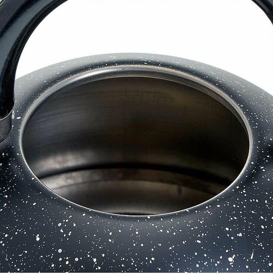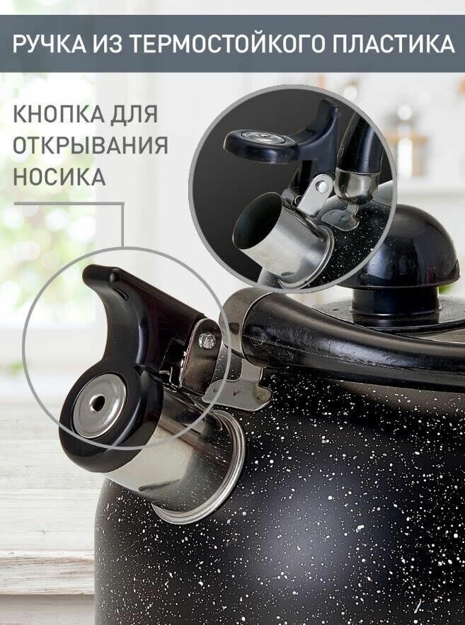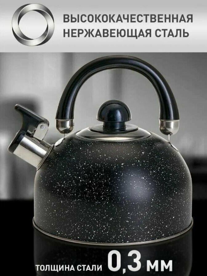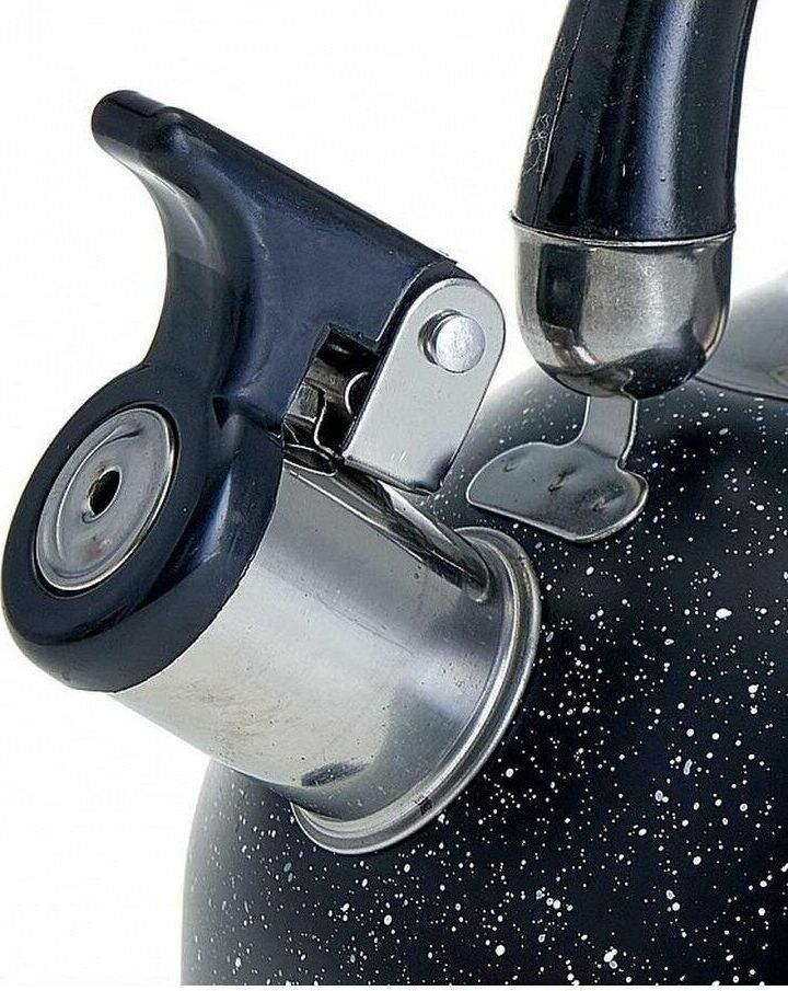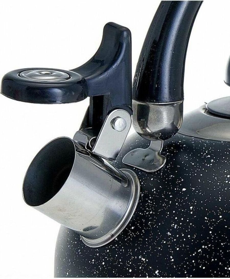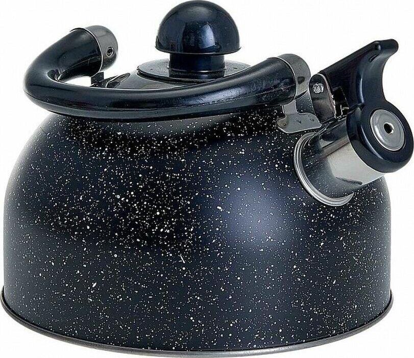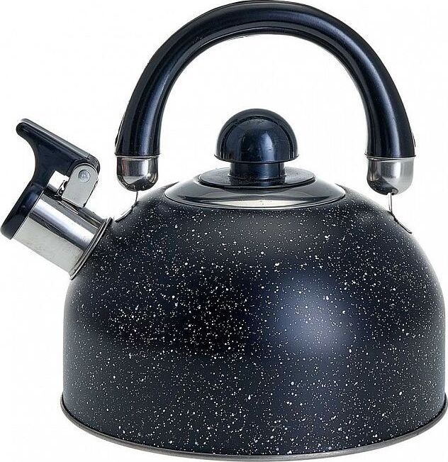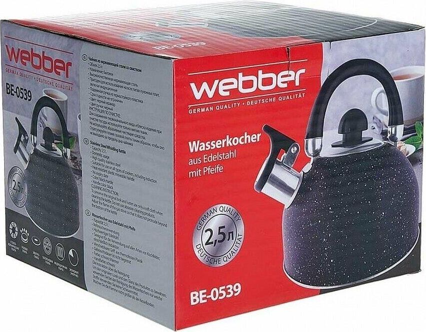 WEBBER BE-0539 Чайник из нерж.стали 2,5л.,индукционное дно Параметры Объем 2,5 л Описание Чайник из нержавеющей стали со свистком Высококачественная нержавеющая сталь c цветным покрытием Цвет: черный мрамор Матовая полировка Индукционное дно Подвижная ручка из термостойкого пластика Цвет ручки: черный Пригоден для использования на всех типах кухонных плит, включая индукционные