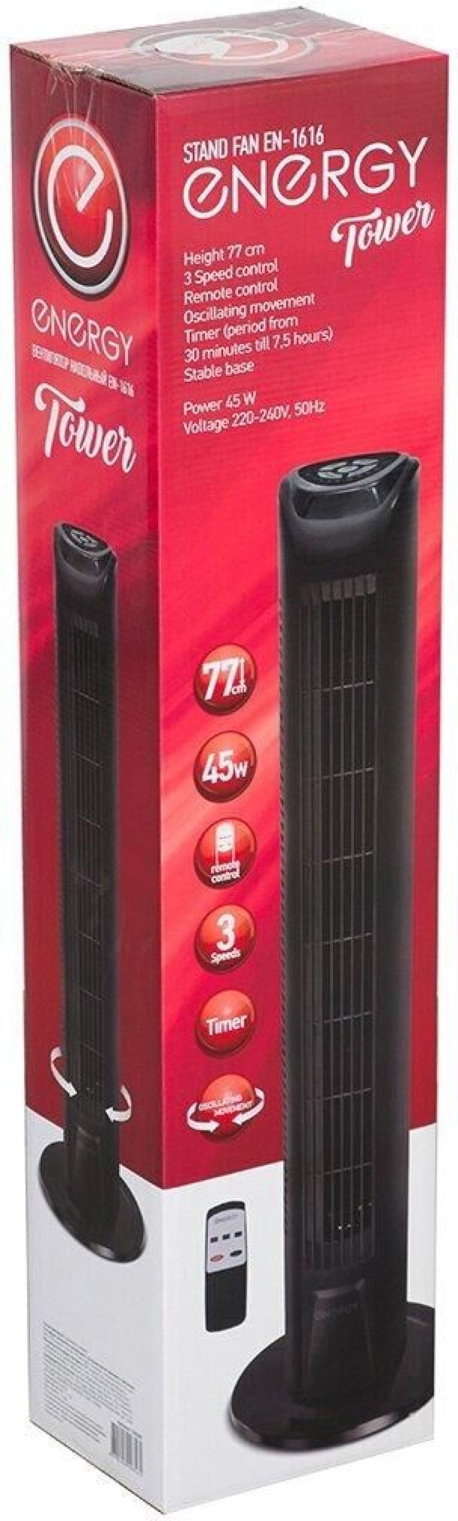 ENERGY EN-1616 TOWER (напольный, колонна) с пультом черный Современный Дизайн Серия TOWER Высота 74 см 3 скорости Пульт Таймер (7,5 часов) Функция поворота Мощность 45Вт