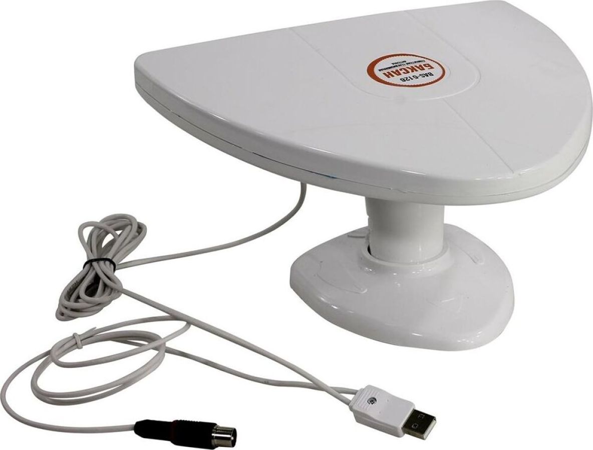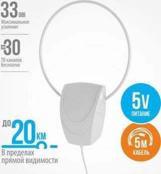 Антенна комнатная, активная, тип антенны: диапазон ДМВ, расстояние до телепередатчика - не более, км: 30, коэффициент усиления, макс., дБи, 21-69 канал: 42, напряжение питания, В: 5-12, волновое сопротивление, Ом: 75, встроенный усилитель , блок питания - в комплекте, длина кабеля, м: 1.8.