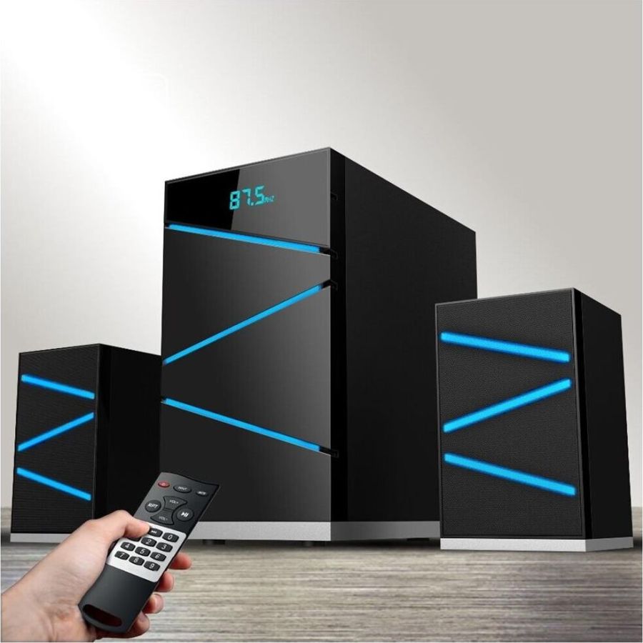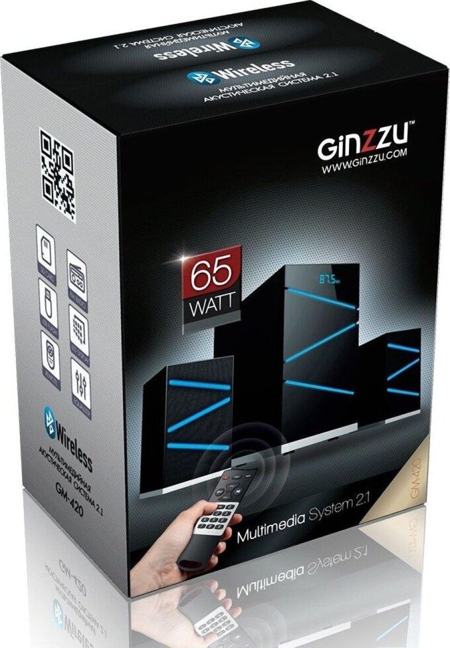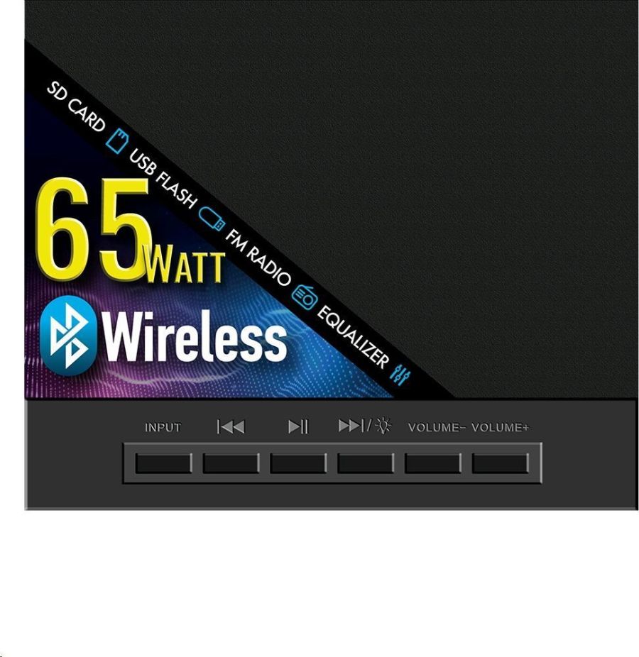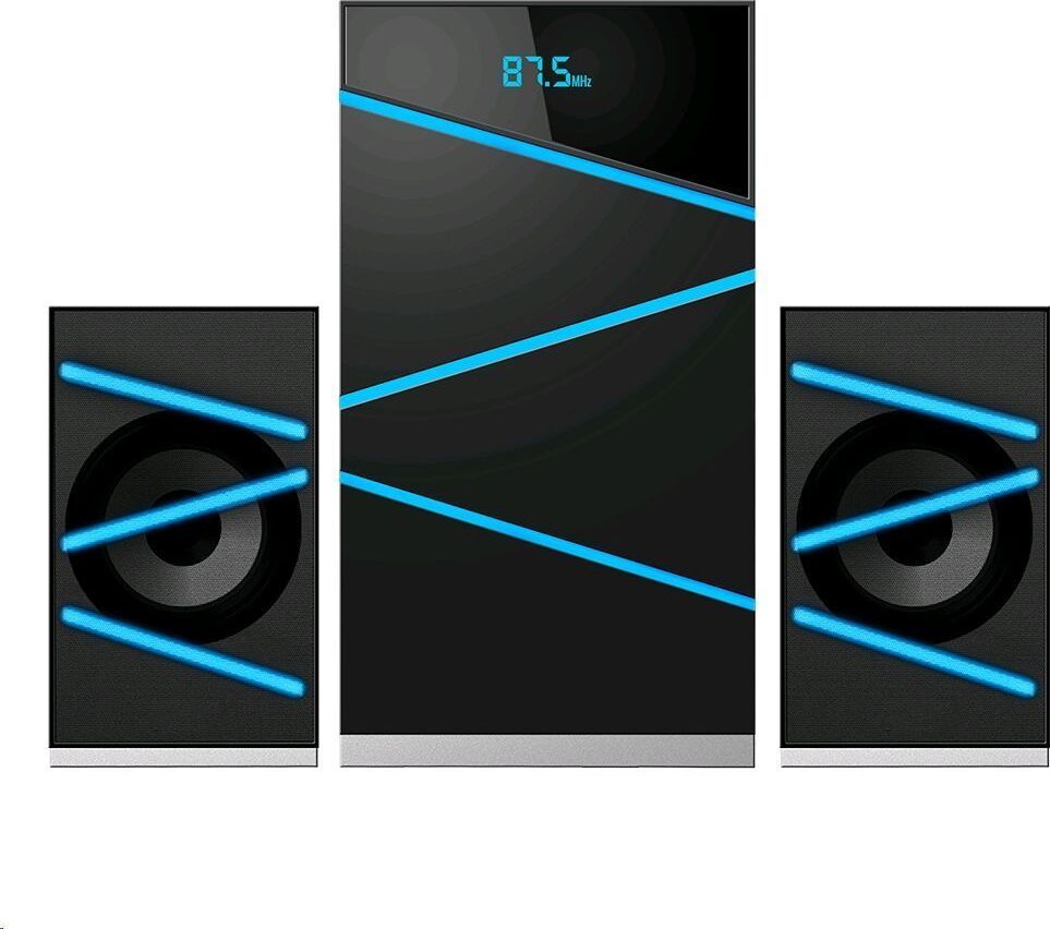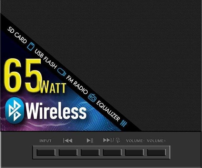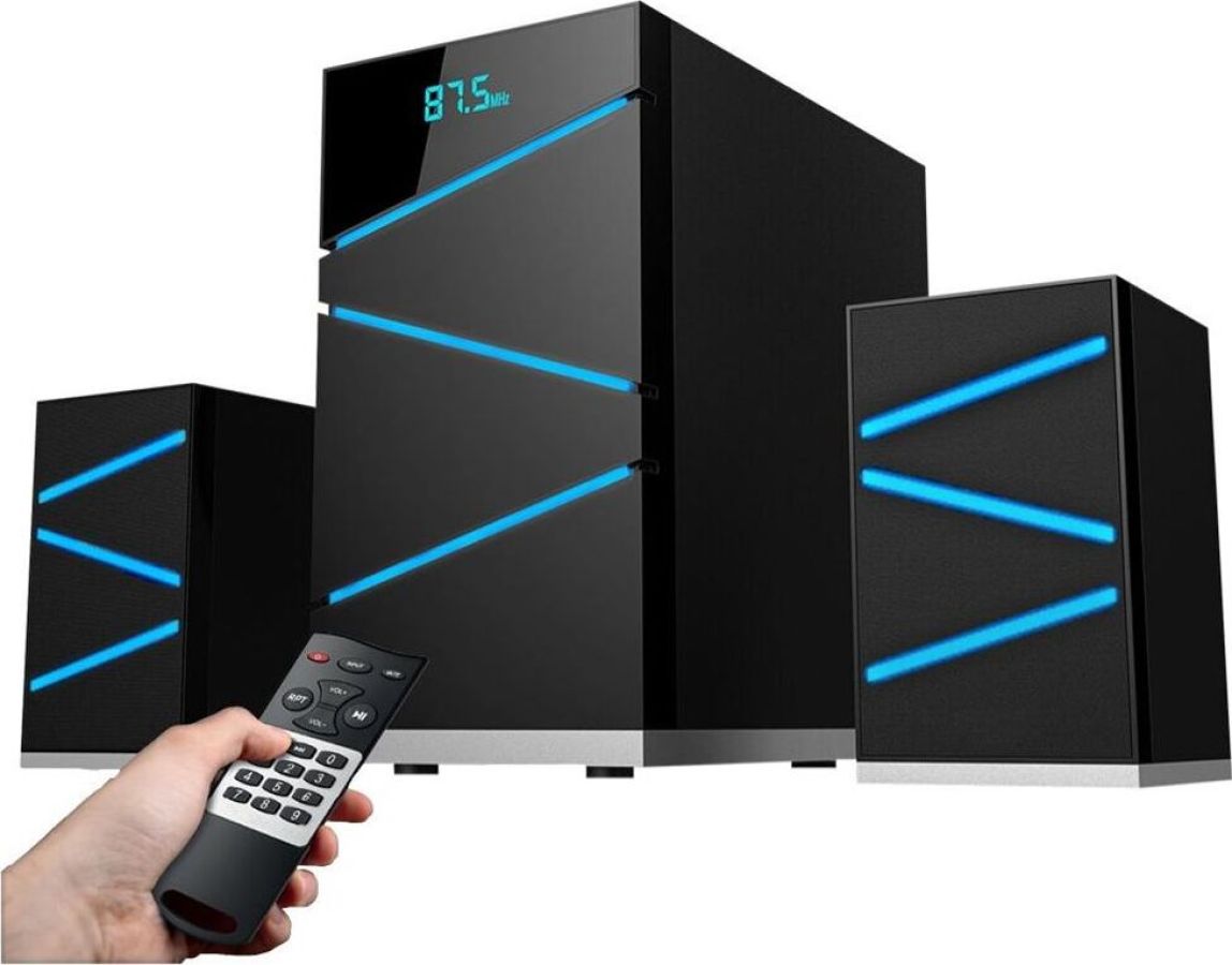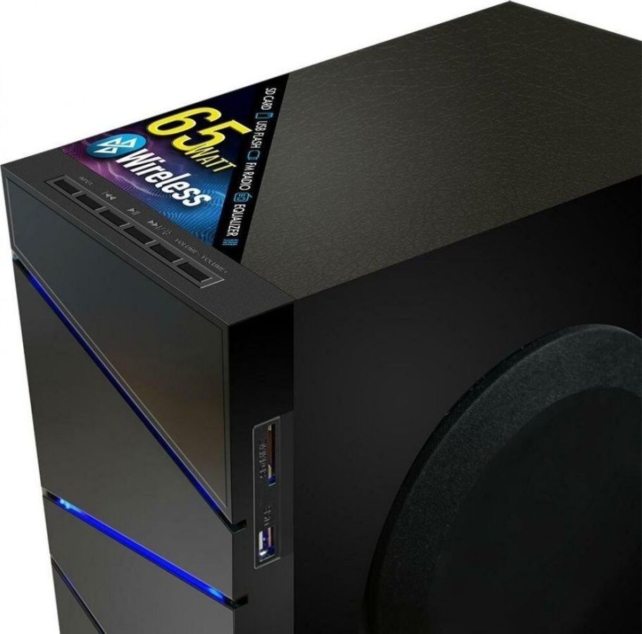 Мультимедийная акустическая система 2.1 с Bluetooth. Выходная мощность (RMS) - 65Вт. Диапазон воспроизводимых частот - 40-20000Гц. Bluetooth: V4.0. Встроенный аудио-плеер: SD-card, USB-flash до 32ГБ. FM радио - 87.5МГц - 108.0МГц. Вход AUX - стерео вход (2RCA). Эквалайзер: классика, поп, джаз, рок, обычный,авто. LED подсветка сабвуфера и сателлитов. Пульт дистанционного управления.
