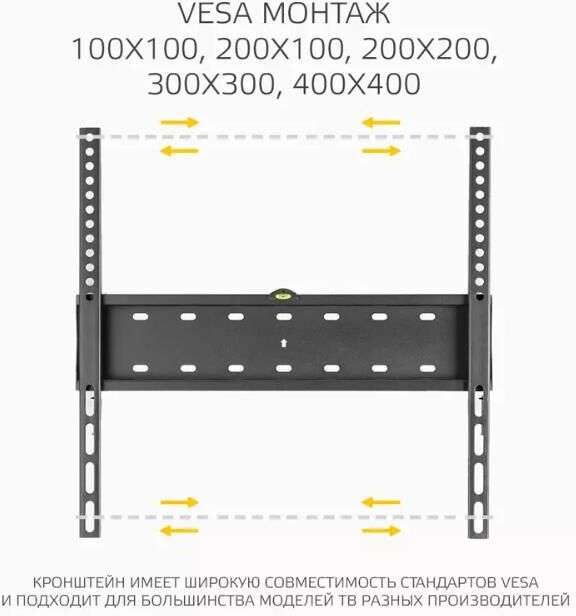 Назначение: для LCD- и LED-телевизоров. Совместимость с диагональю ТВ: 32, 40, 42, 43, 50, 55. Тип кронштейна: фиксированный. Совместимость: поддерживает ТВ с диагональю 32-55. Максимальный вес ТВ: 40 кг. Крепление стандарта Vesa: до 400х400. Типы VESA: 100x100, 200x100, 200x200, 300x300, 400x400. Угол наклона: 0°. Материал корпуса: сталь. Минимальное расстояние от стены: 27 мм. Максимальное расстояние от стены: 27 мм. Комплектация: Кронштейн, вертикальные опоры, крепежные детали, инструкция, гарантийный талон. Цвет: черный. Размеры (ШхВхГ): 433x425x27 мм.