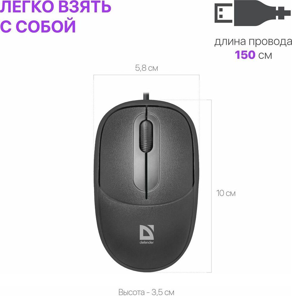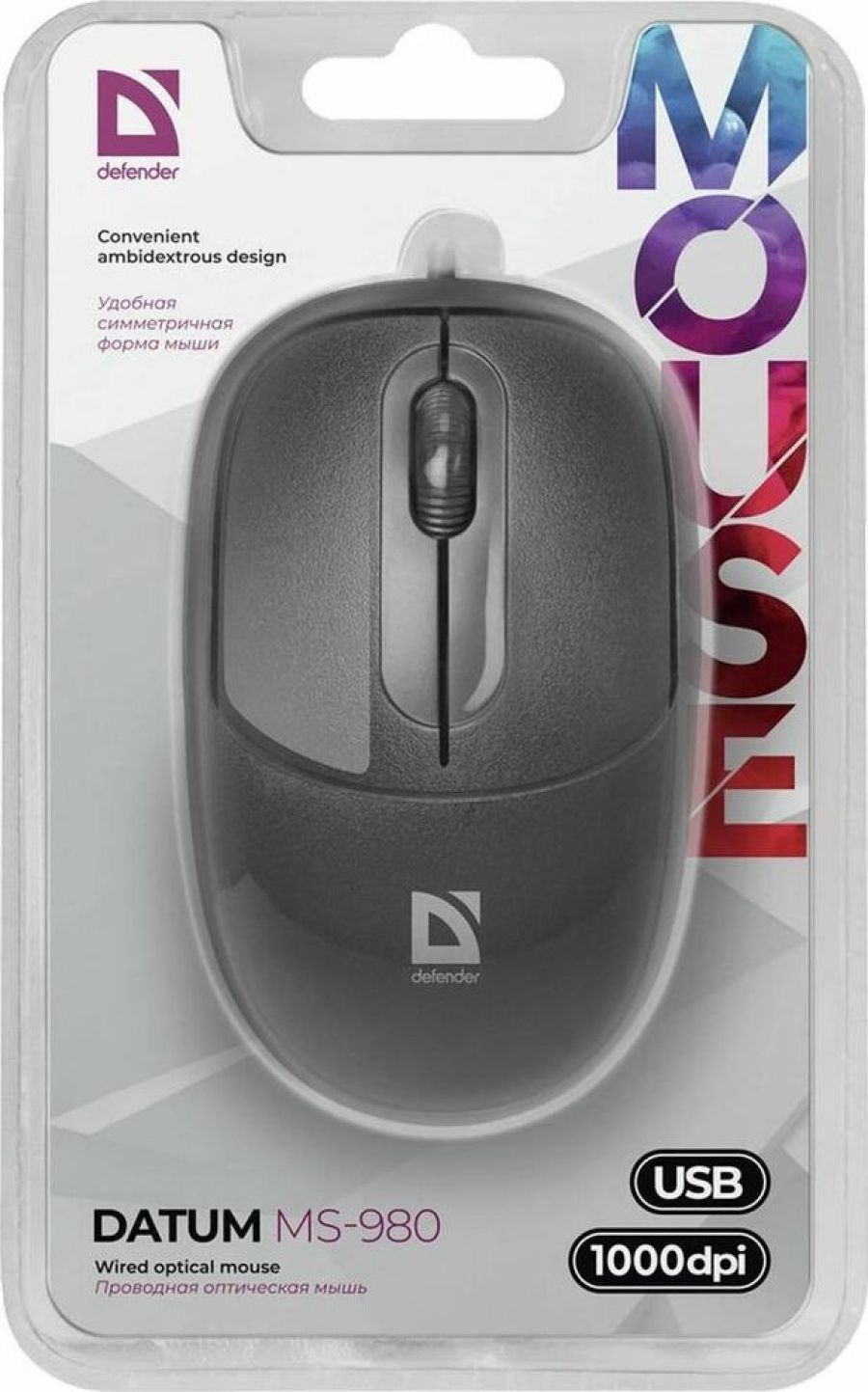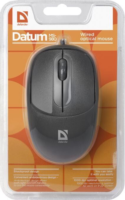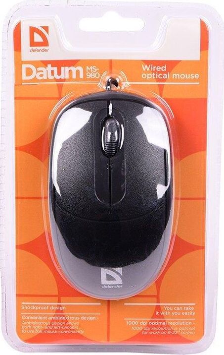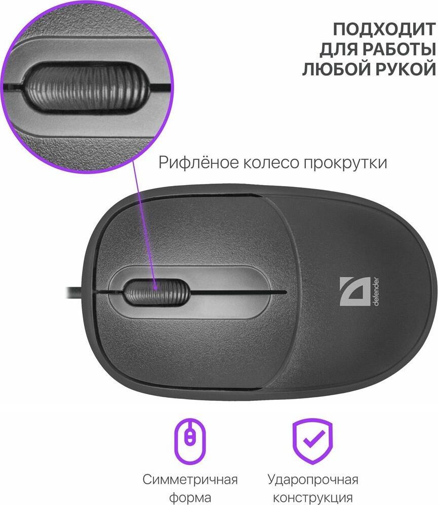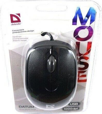 Мышь проводная, оптическая, интерфейс USB, количество кнопок - 2 + колесо-кнопка, разрешение - 1000 dpi, длина кабеля - 1.4 м.