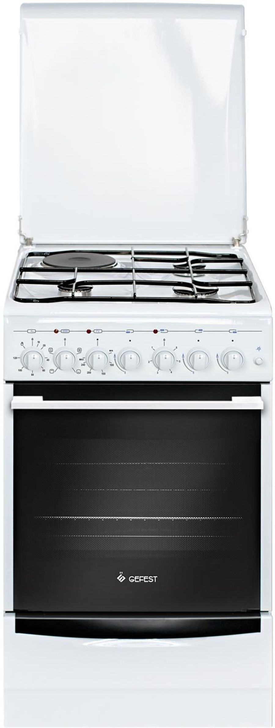 Габариты, ШхГхВ, см: 50x58.5x85; Цвет: белый; Дизайн: классический; Фасад: эмалированный; Варочная поверхность: эмалированная; Ширина, см: 50; Решетки стола: стальные; Крышка стола: металлическая; Присоединительная резьба газопровода: G 1/2; Класс энергоэффективности: A; Номинальная потребляемая мощность электроэнергии, кВт: 2,75-3,02; Тип духовки: электрическая; Мощность верхнего ТЭН духовки, кВт: 0,8; Мощность нижнего ТЭН духовки, кВт: 1,2; Объем духовки, л: 55; Таймер: электромеханический; Электророзжиг горелок стола: кнопка на панели; Гриль: электрический; Вертел с электроприводом; Подсветка духовки: одинарная; Направляющие духовки: съемные проволочные; Терморегулятор (термостат); Ящик для посуды и принадлежностей: выдвижной ящик; Ножки регулировочные; Сетевой шнур и вилка: в наличии; Комплектность: жаровня, комплект сменных сопел, решетка духовки