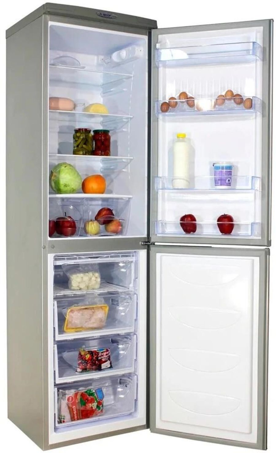 Габариты (ВхШхГ)191х58х61,4х61см. 2-камерный. Объем 349л, (209/140) Объем морозильной камеры 140, Вес 69кг. Уровень шума, дБ 41. Управление электромеханическое.1 компрессор.Размораж-е морозильной камеры ручное. Размораж-е холодильной камеры капельная система. Цвет металлик искристый