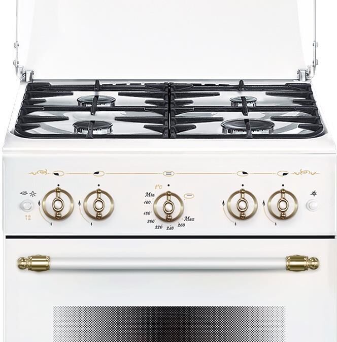 Габариты, ШхГхВ, см: 50x58.5x85; Цвет: белый, с рисунком "ретро"; Дизайн: ретро; Ширина, см: 50; Фасад: эмалированный; Варочная поверхность: эмалированная; Решетки стола: чугунные; Класс электробезопасности: I; Объем духовки, л: 52; Мощность горелки духовки, кВт: 3,1; Мощность гриль-горелки, кВт: 1,9; Газ-контроль духовки; Электророзжиг духовки: кнопка на панели; Электророзжиг горелок стола: кнопка на панели; Гриль: газовый; Подсветка духовки; Направляющие духовки: съемные проволочные; Терморегулятор (термостат); Ящик для посуды и принадлежностей: выдвижной; Ножки регулировочные; Сетевой шнур и вилка: в наличии; Стекло дверцы духовки: двойное; Комплектность: жаровня, накладка для посуды малого диаметра, противень, решетка духовки; Комплект сменных сопел