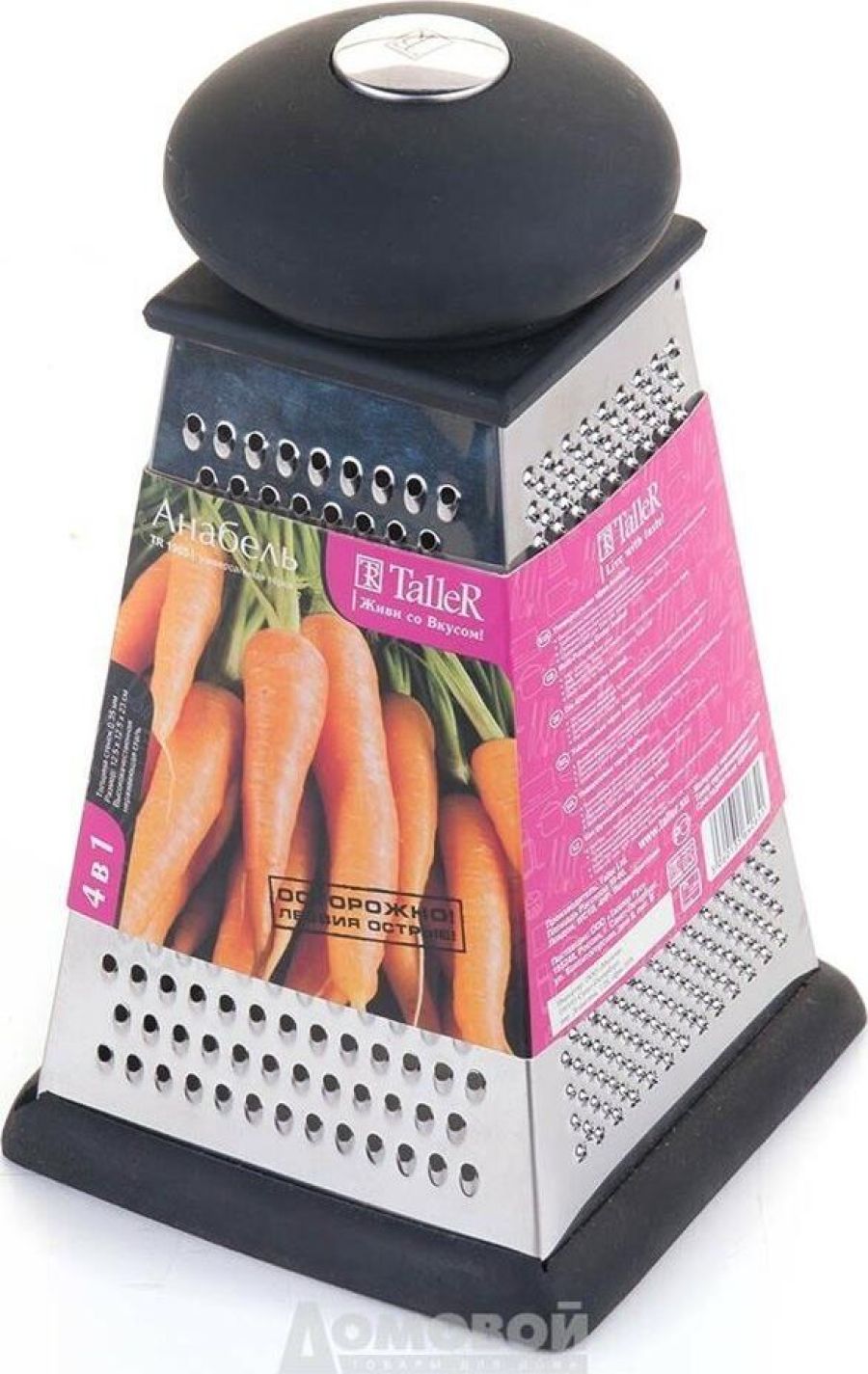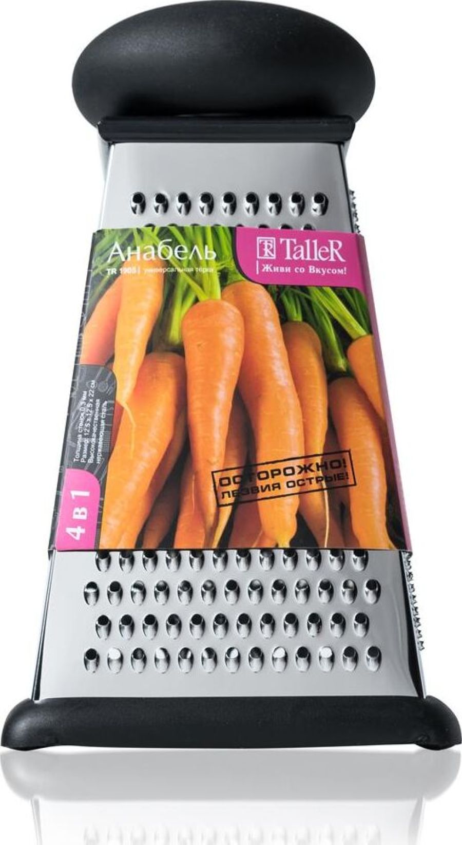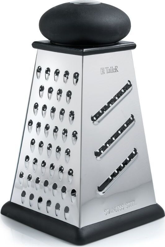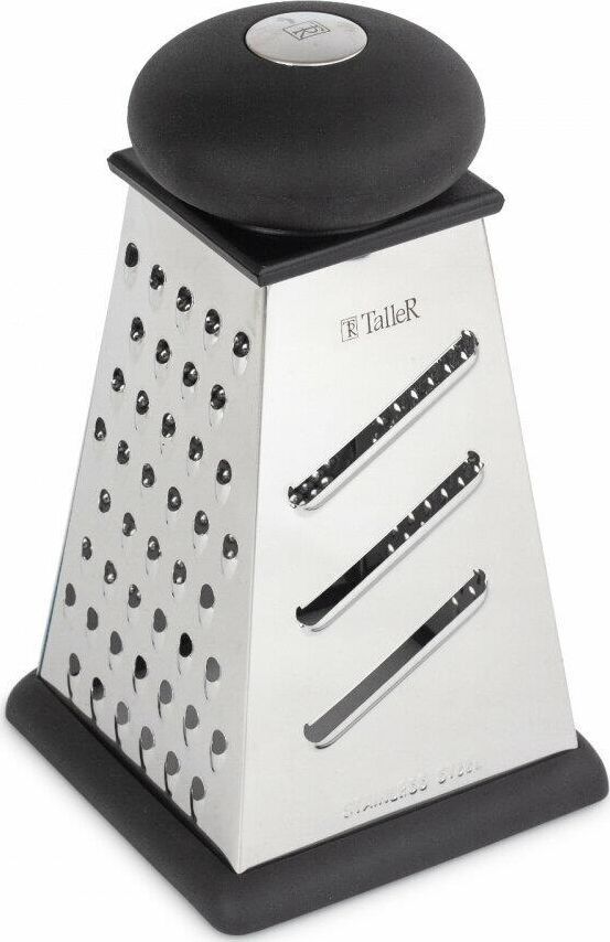 Высота 22 см. Основание 12.5 х 12.5 см.4 вида лезвий: крупная терка,средняя терка,мелкая терка, шинковка, Ручка удобной формы не выскальзывают из рук даже при намокании. Нескользящий силиконовый протектор на основании предотвращает скольжение во время ис