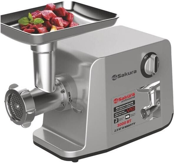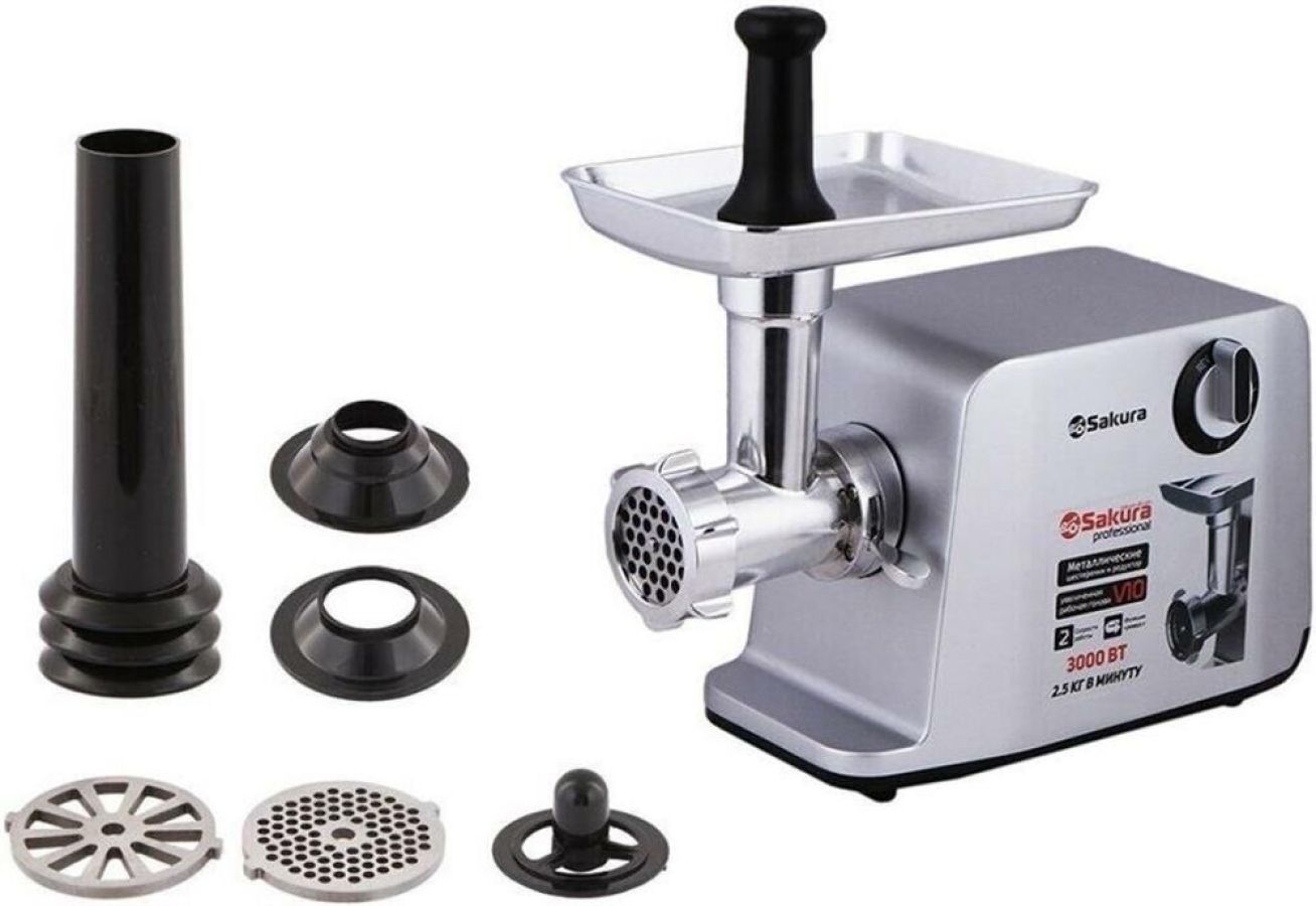 Мясорубка электрическая, мощность 3000 Вт, функция реверс, литой алюминиевый корпус, две скорости работы, мощный медный мотор с защитой от перегрева, металлические шестеренки и металлический редуктор, набор решеток для фарша: маленькая (4мм), средняя (7мм) и для рубки мяса, низкий уровень шума - менее 85 дБ, простой и надежный фиксатор рабочей головы, прорезиненные нескользящие ножки. Аксессуары: насадки для приготовления сосисок и колбасок кеббе. Производительность: 2.5кг/мин. Цвет: серый.