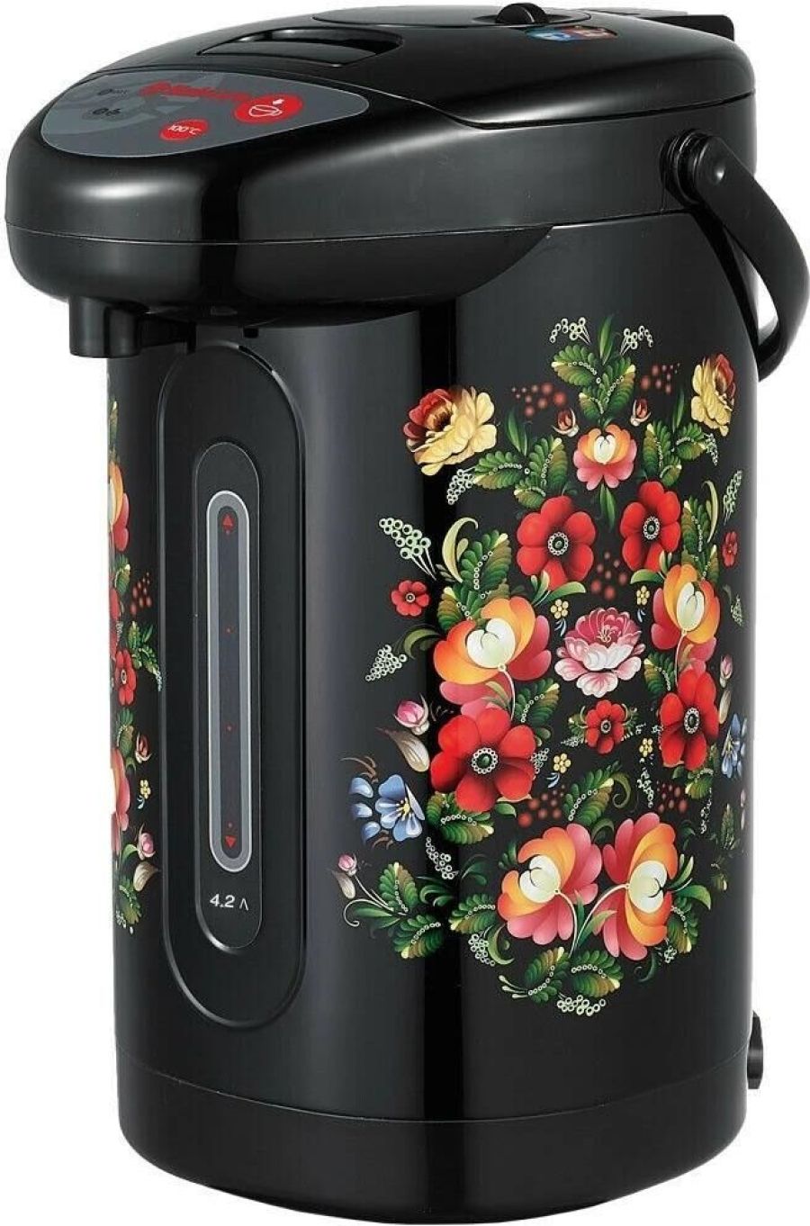 4,2 л, 750 Вт, повторное кипячение, поддержание температуры, 3 способа подачи воды (помпой, кнопкой на панели и нажатием чашкой), колба нерж.сталь. Цвет: черный с узором