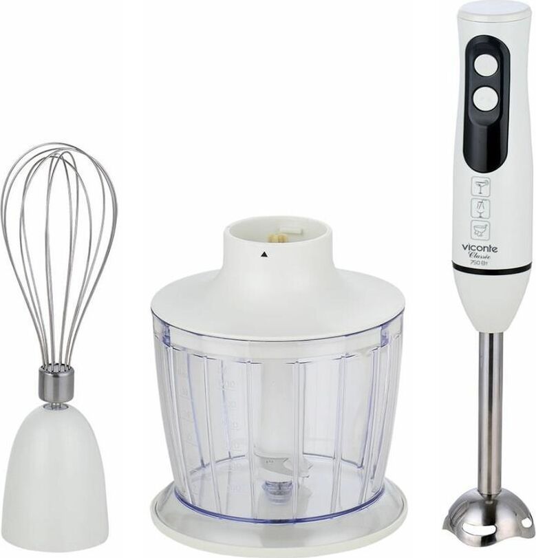 Погружной блендер Viconte VC-4441 800 W, Погружной блендер, мощность 800W, современный эргономичный дизайн, пульсовый режим работы, 2 скорости, лезвия из нержавеющей стали, металлическая нога блендера, венчик для взбивания, чаша с ножом для рубки и измельчения, 600 мл; автоматическая блокировка при неправильно установленной насадке, удобство и простота в обращении и чистке.