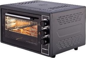 (ШxВxГ)в упаковке 51х44,5х40,5 см.Цвет черный.Объем 38л. Мощность 1500 Вт. Макс.температура 320 °С.Таймер отключения 90 мин. Количество режимов работы 3. Внутренняя подсветка.Длина шнура 1,2 м. Решетка, противень для выпечки прямоугольный, противень круглый, термостат.