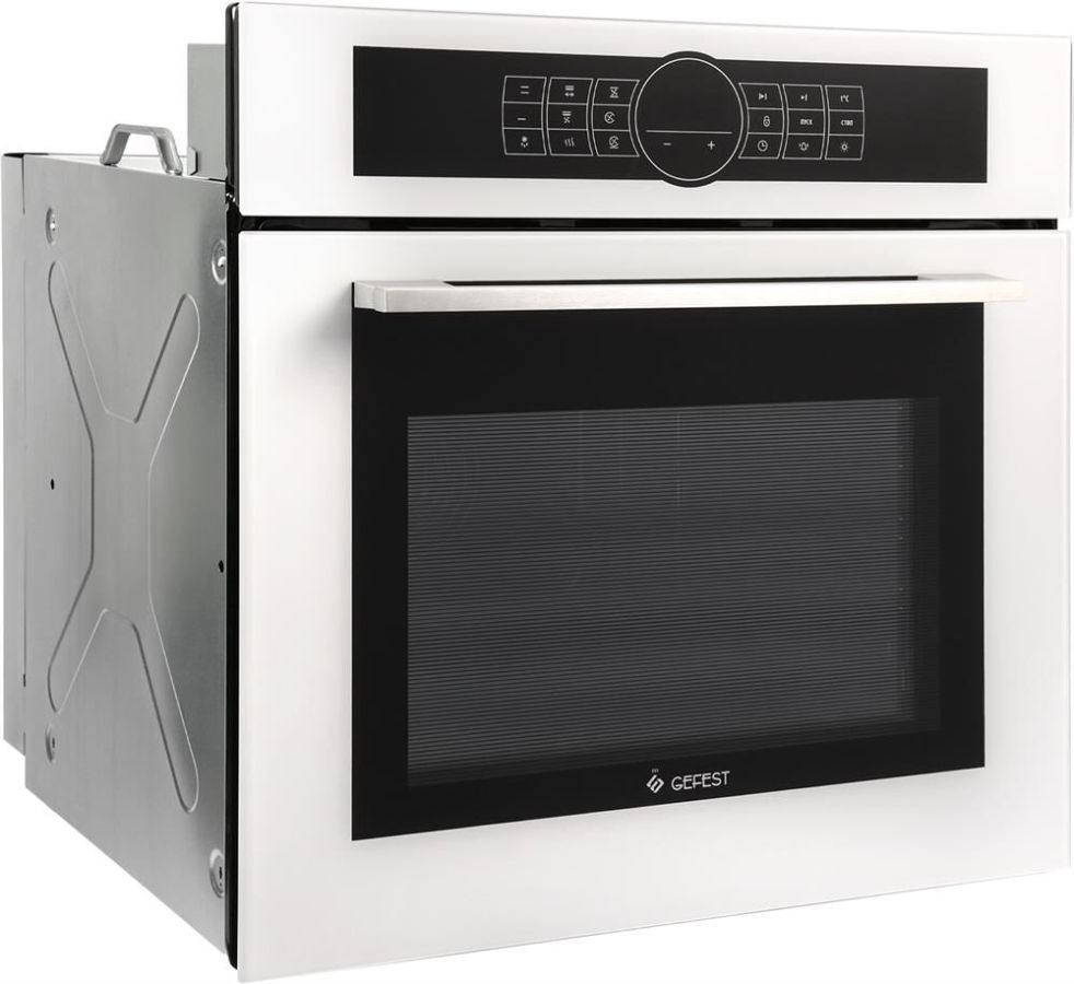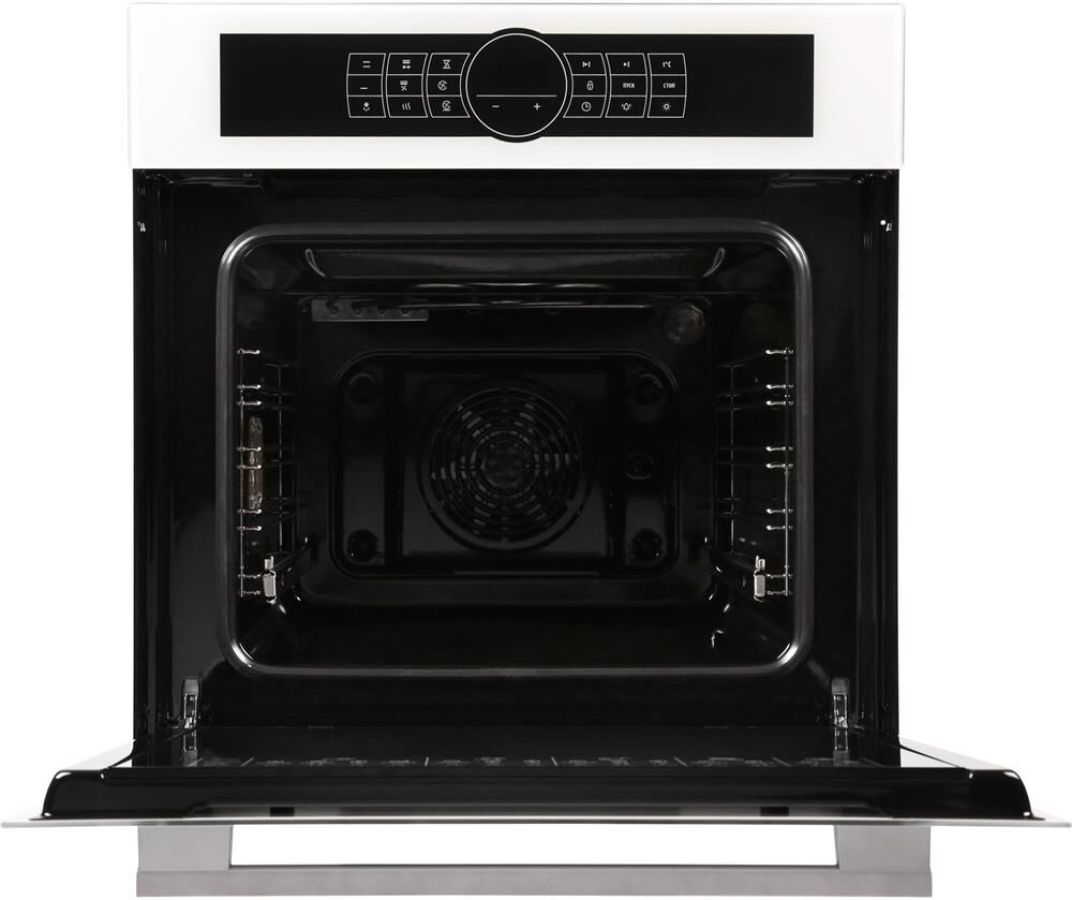 Духовой шкаф электрический. Цвет: белый. Габаритные размеры ШхГхВ: 59.8х56.5х59.5 см. Объём духовки: 55л. Вертел с электроприводом. Гриль электрический. Доводчик «Soft-Close». Объемный нагрев с конвекцией. Подсветка духовки двойная. Сенсорное управление. Съемные проволочные направляющие духовки. Таймер сенсорный многофункциональный. Телескопические направляющие. Ускоренный нагрев с конвекцией. Шашлычница.