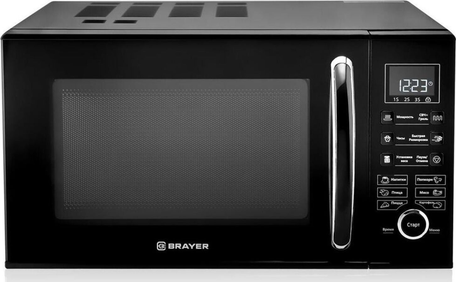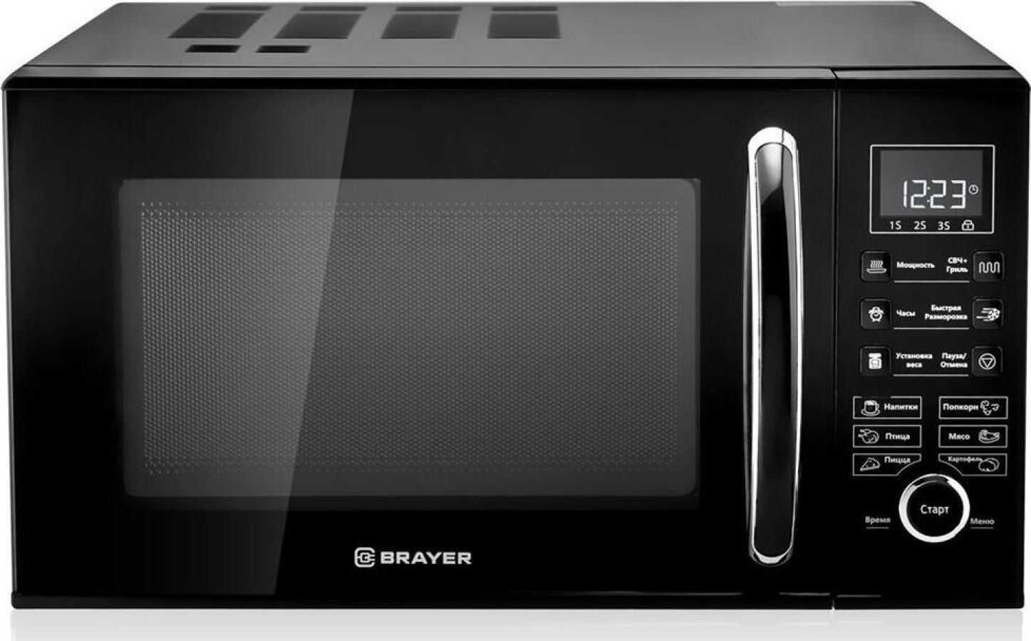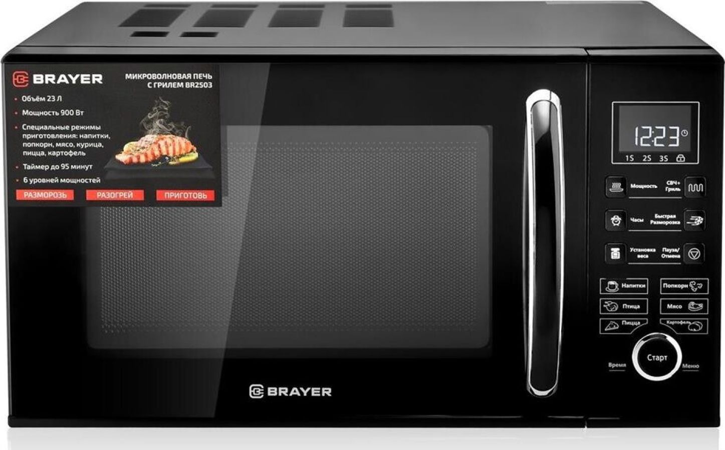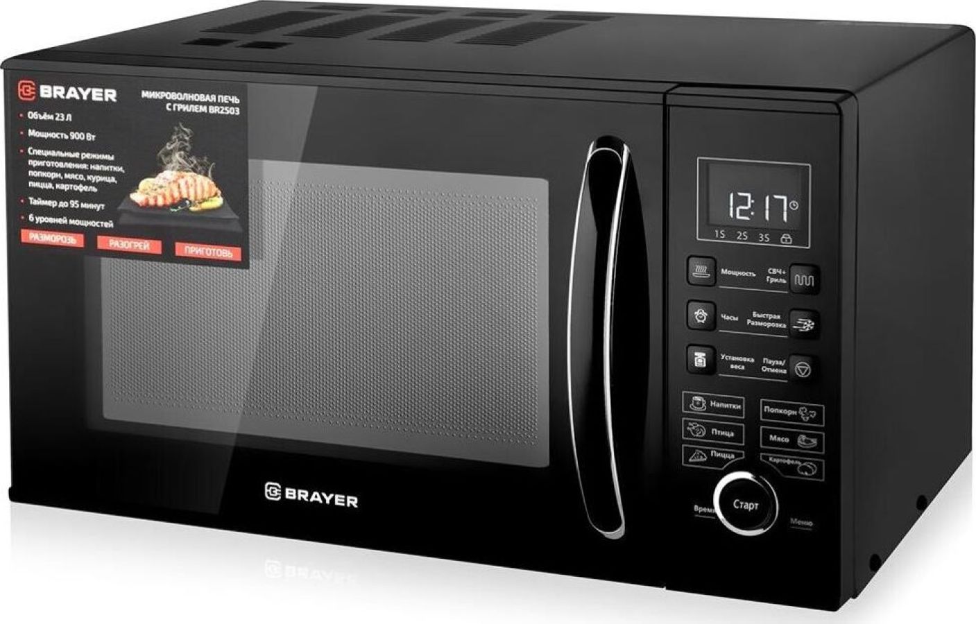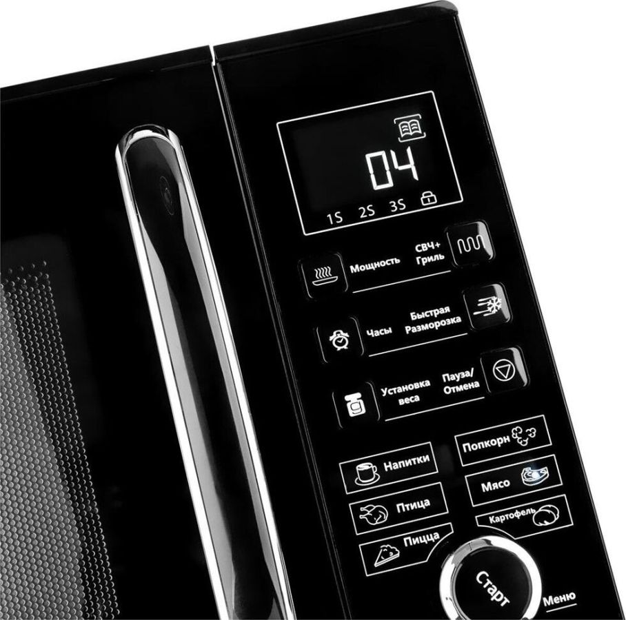 Внутренний объём: 23 л. Номинальная микроволновая мощность: 900 Вт. Цифровое управление. Мощный гриль: 1000 Вт. 6 уровней мощности. Быстрая разморозка. Программирование последовательного приготовления. Блокировка кнопок для безопасности. Автоматическая установка времени приготовления. в зависимости от веса продукта LED-дисплей. Электронные часы. Таймер до 95 минут. Номинальная потребляемая мощность. в режиме микроволн: 1400 Вт. Защита от поражения электрическим током: I класс. Рабочая частота: 2450 МГц. Сигнал завершения приготовления. Стеклянное вращающееся блюдо: O 270 мм. Габаритные размеры: 281*483*387 мм. Масса нетто: 14,1 кг. Электропитание: 220-240 В, ~50 Гц.