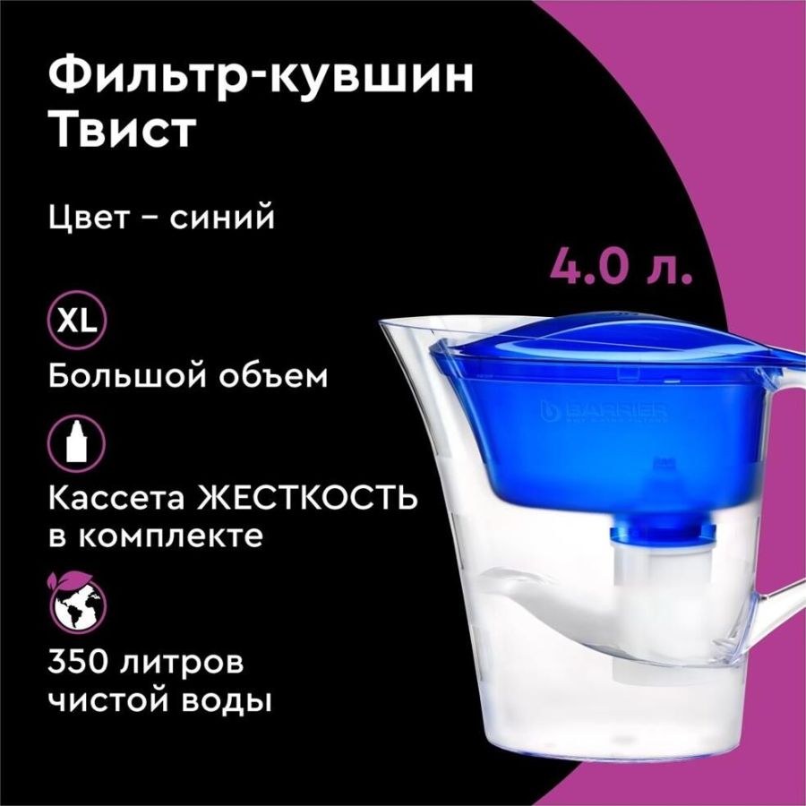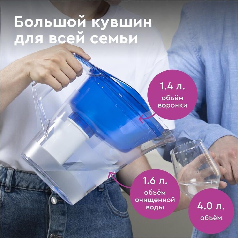 Объём кувшина 4 л, Размеры упаковки 300x150x250мм, Возможность размещения в дверце холодильника нет, Объём очищенной воды 1,6 л, Наличие и тип индикатора ресурса Нет индикатора, Объём фильтра-кувшина большой, Цвет синий, Объём воронки 1,4 л