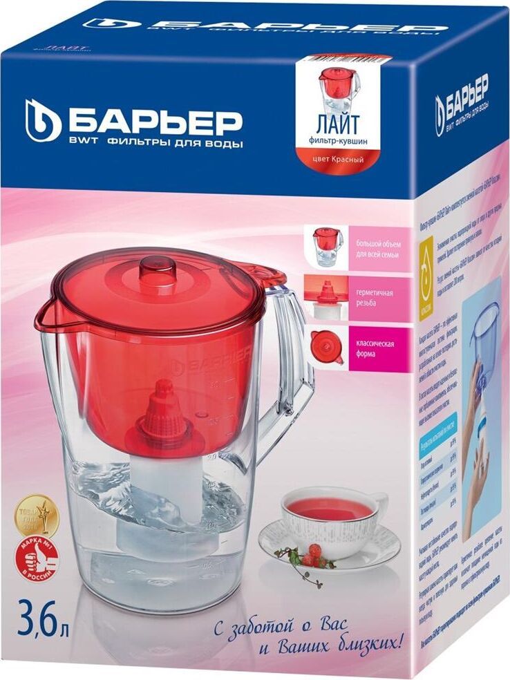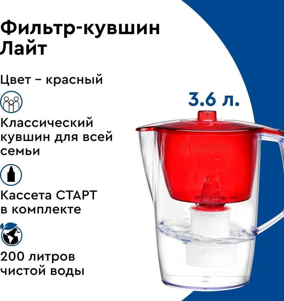 Классический кувшни для большой семьи, объем кувшина 3,6 литра, объем воронки 1,5 литра, классическая круглая форма, мерная шкала на корпусе, срок службы не более 5 лет, цвет: красный, кассета в комплекте, ресурс кассеты 200 л.