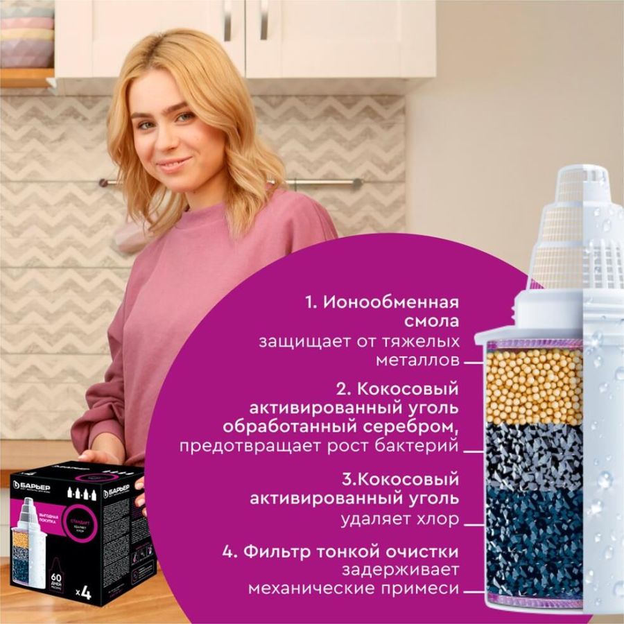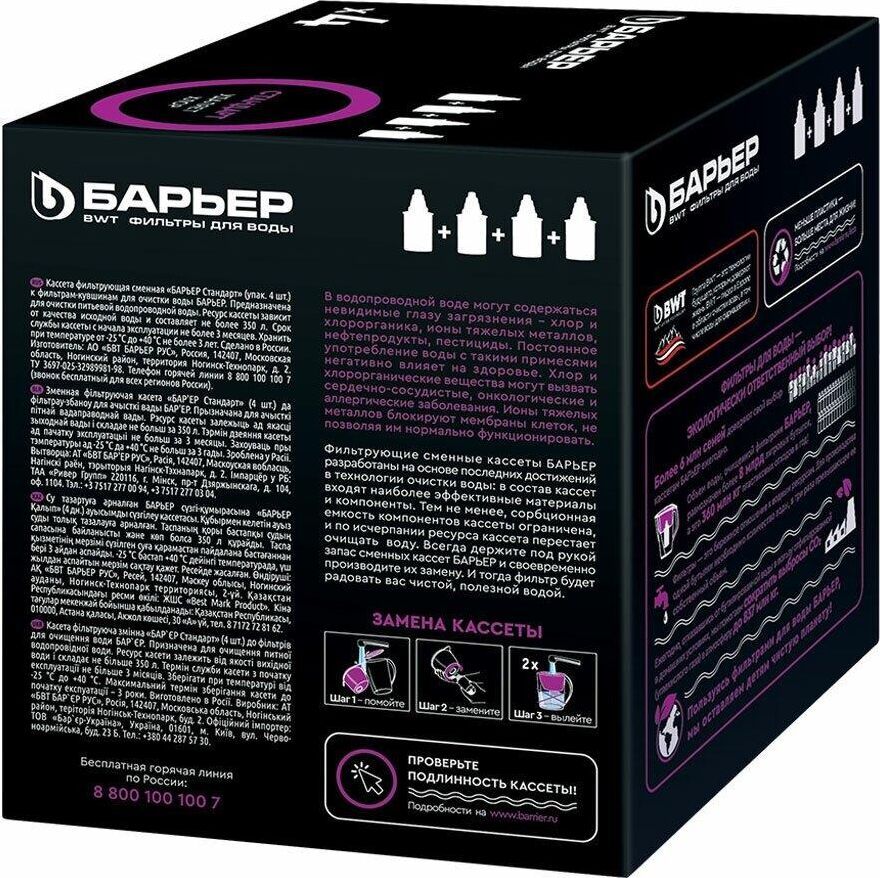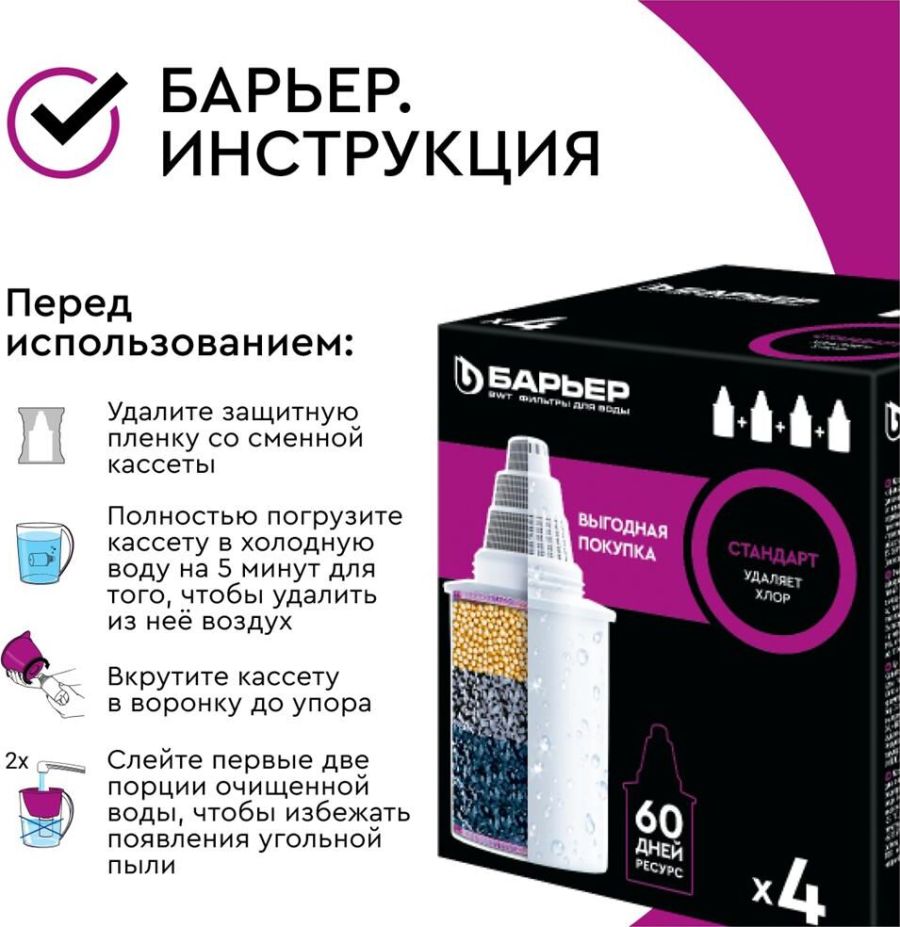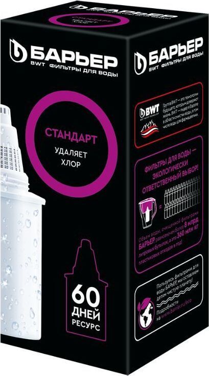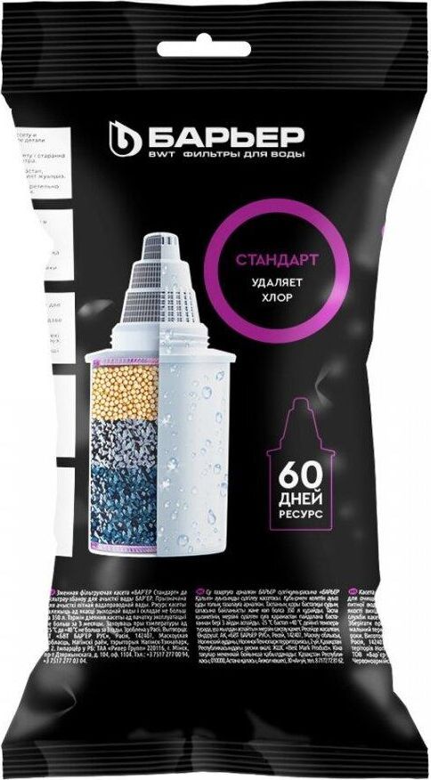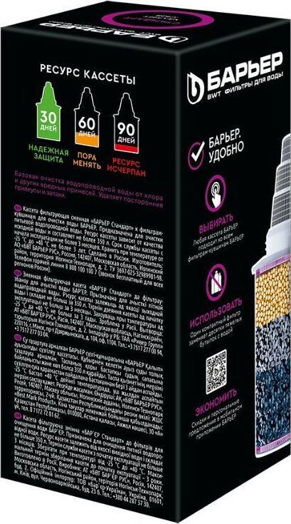 Кассета «Барьер СТАНДАРТ» предназначена для доочистки водопроводной городской воды без накипи. Устраняет: хлор, свинец, ртуть, ржавчина, песок, другие твердые частицы, побочные продукты хлорирования. Ресурс кассеты составляет 350 литров. Кассета «БАРЬЕР Стандарт» подходит ко всем фильтрам-кувшинам БАРЬЕР.