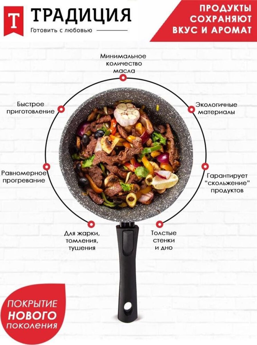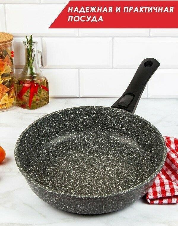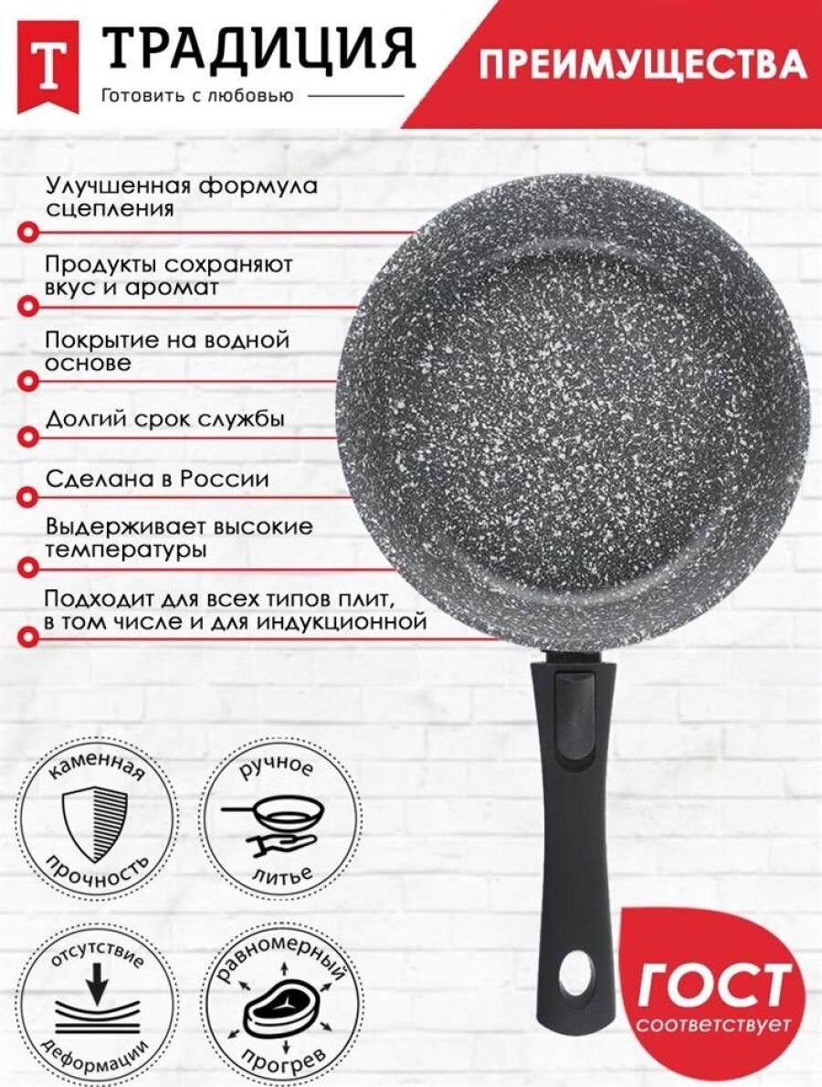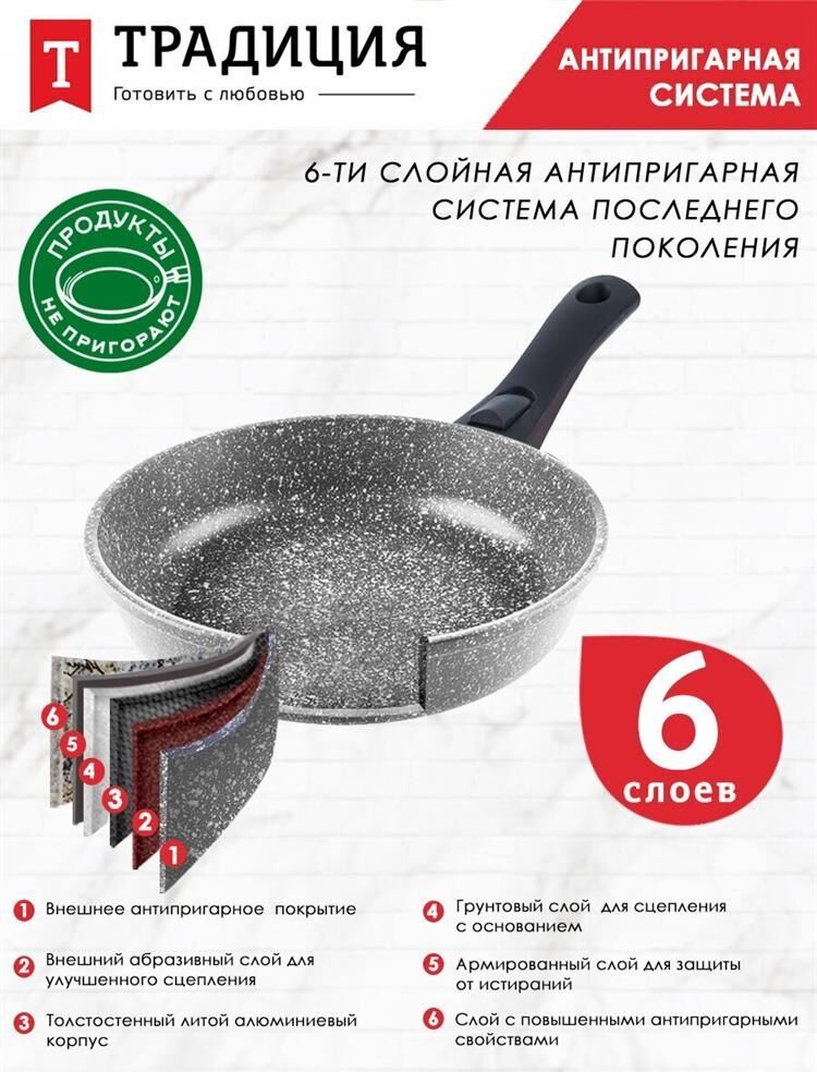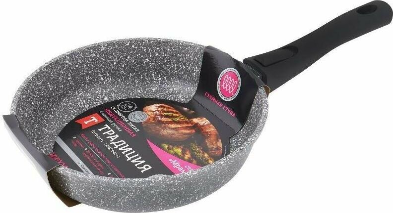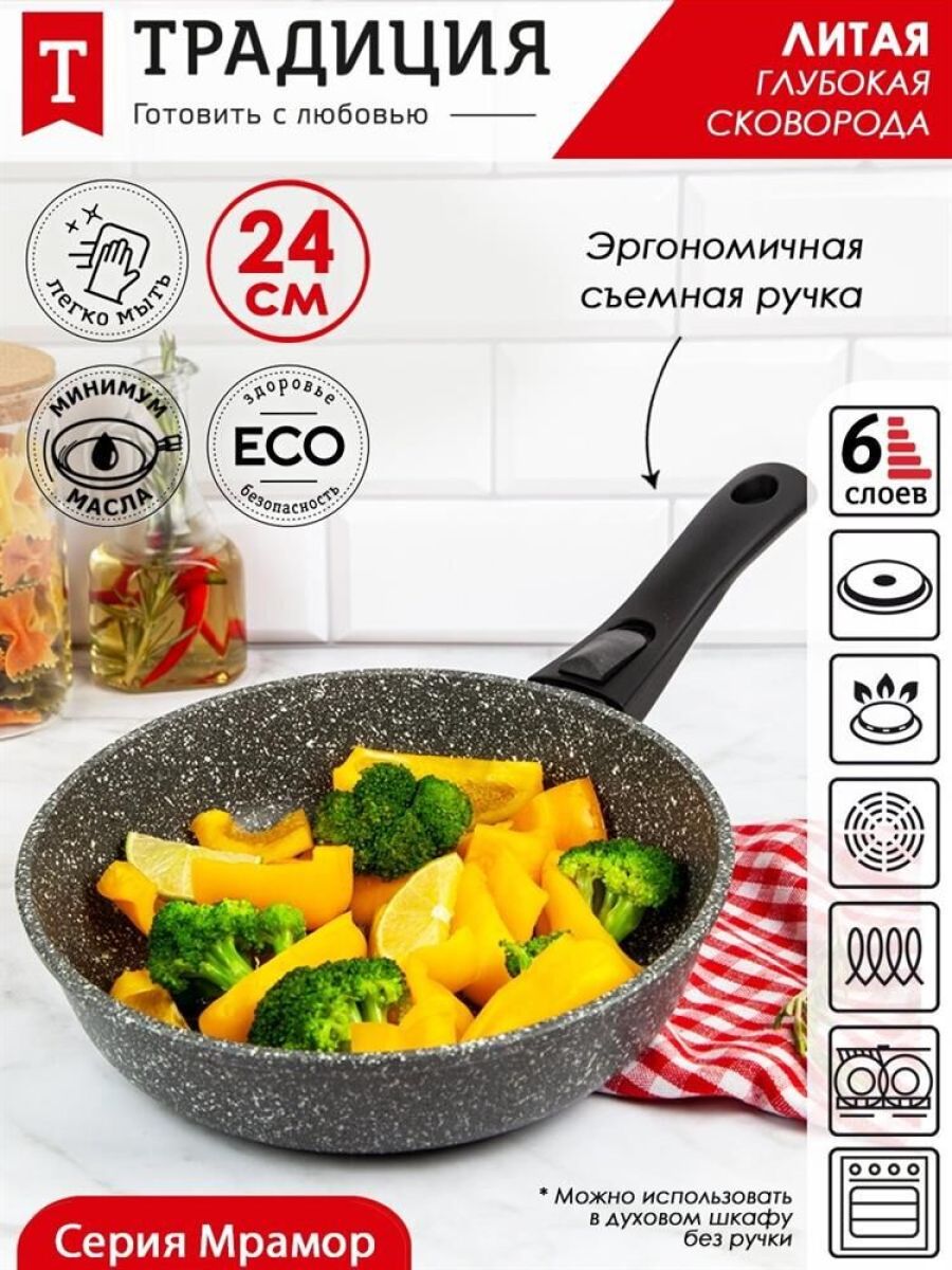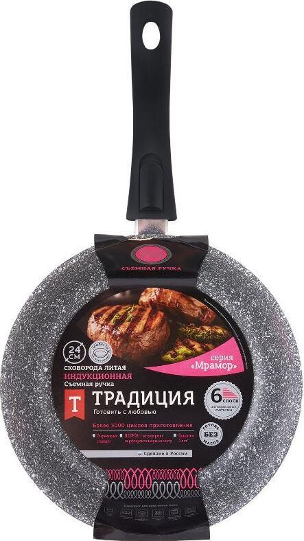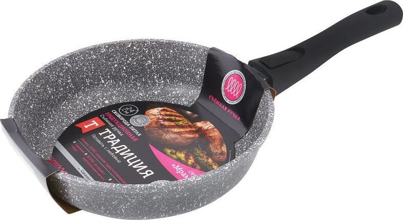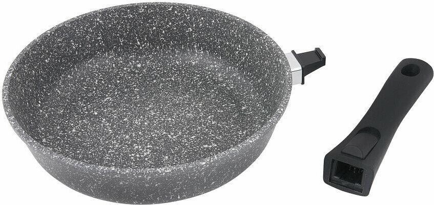 Сковорода 24 см Мрамор. Материал: пищевой литой алюминий. Антипригарное мраморное покрытие. Подходит для всех тип плит, в том числе индукционных. Имеет съемную ручку, легко чистится. Можно мыть в посудомоечной машине. Без крышки.