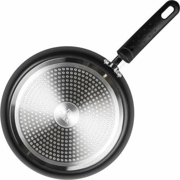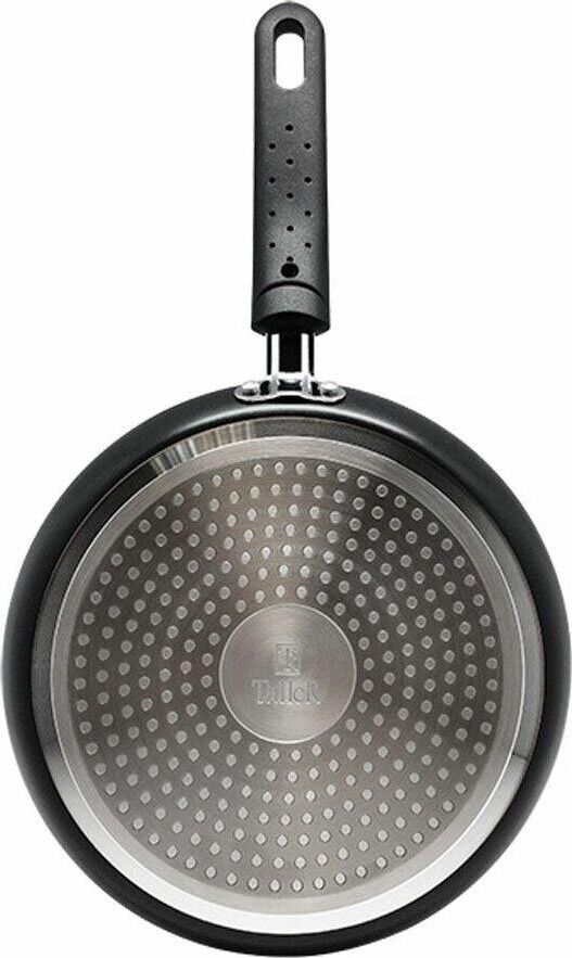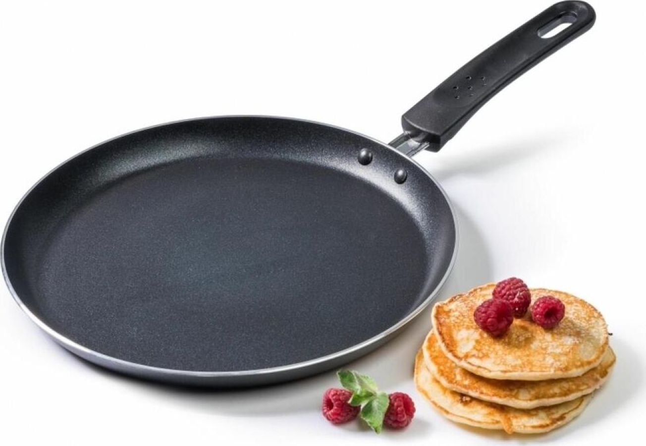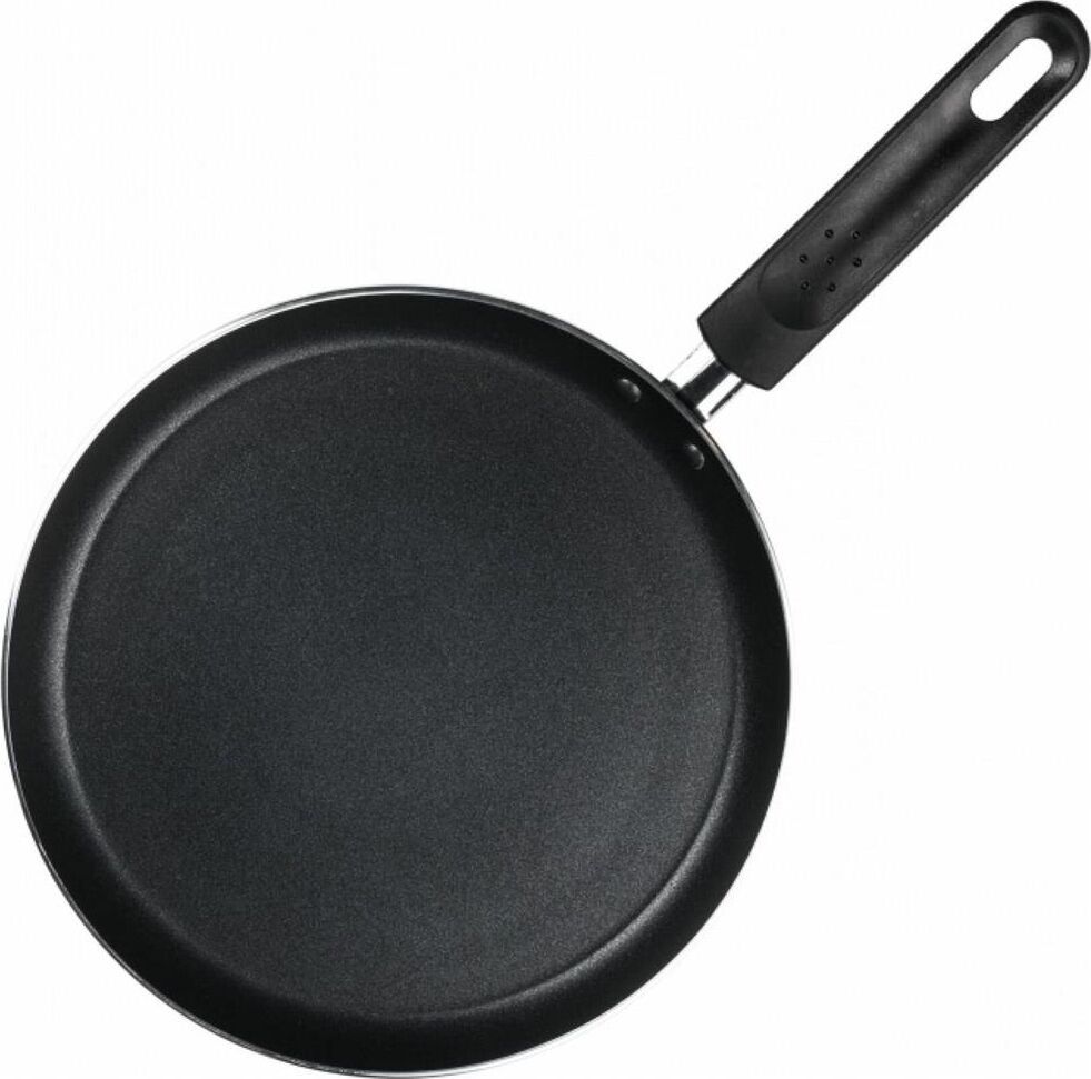Сковорода блинная из штампованного алюминия, диаметр 24см. Толщина дна 3мм. Внешний диаметр дна 20,6 см. Подходит для всех типов плит. Бакелитовая ручка не нагревается при использовании конфорки или газовой горелки, не превышающей диаметр дна сковороды.