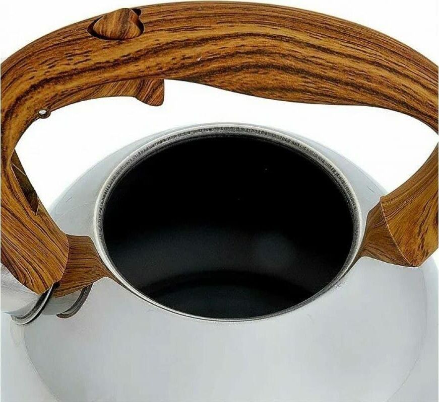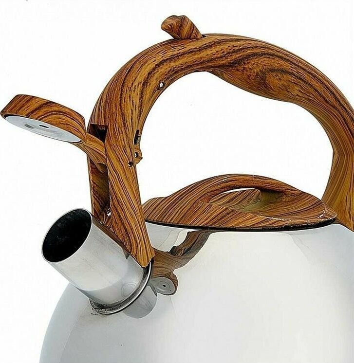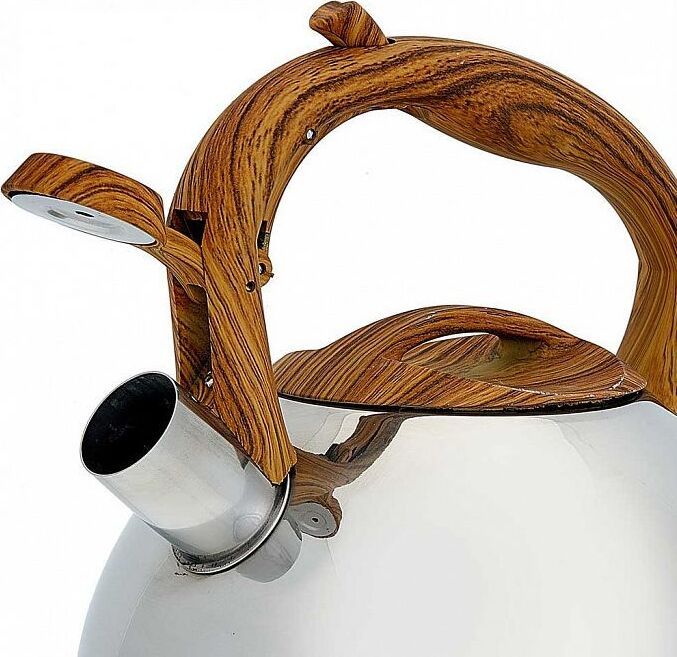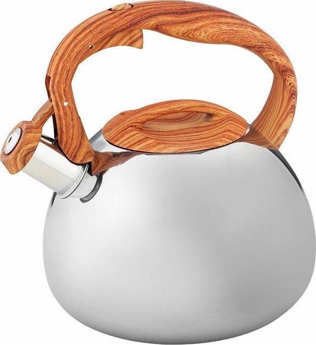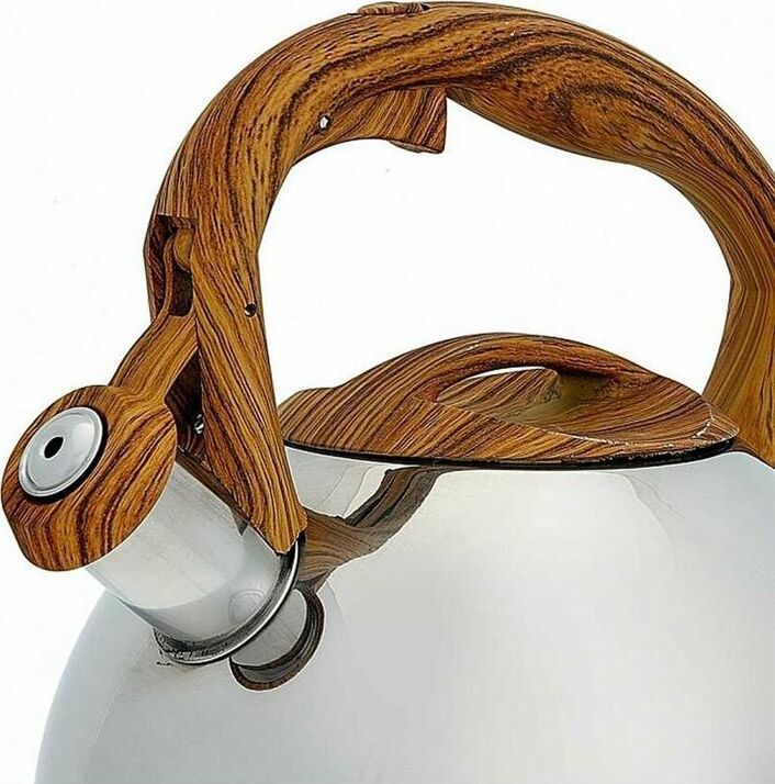 ALPENKOK AK-517 Чайник нерж.сталь со свистком 3,0л (12) Параметры Объем 3 л Толщина стали 0,6 мм Описание Чайник из высококачественной нержавеющей стали со свистком Зеркальная полировка Ручка с противоскользящим покрытием и с кнопкой для открывания носика Цвет ручки и крышки: дерево Индукционное дно Пригоден для использования на всех типах кухонных плит Упаковка: цветная коробка