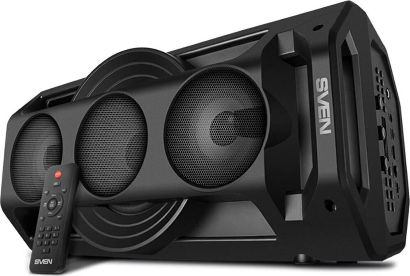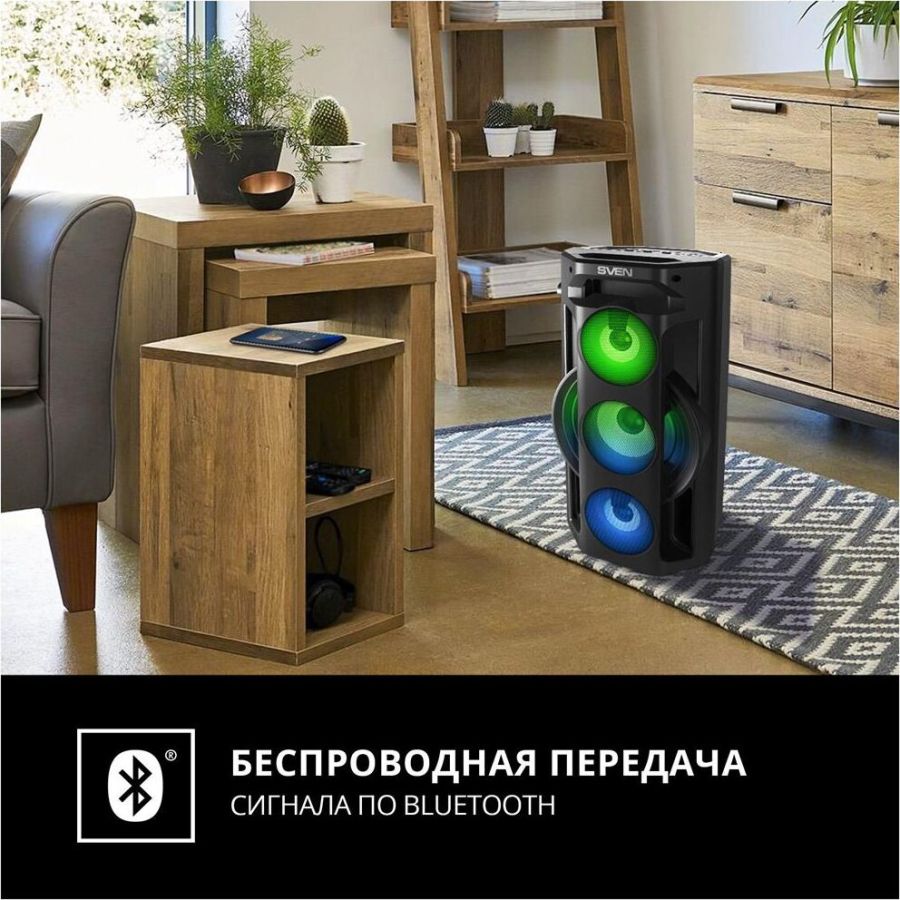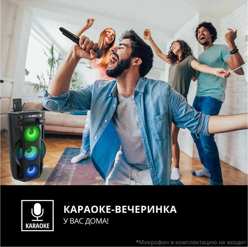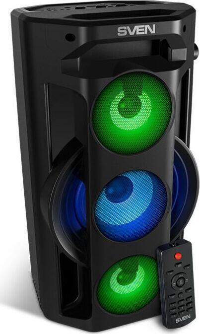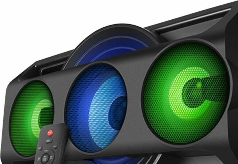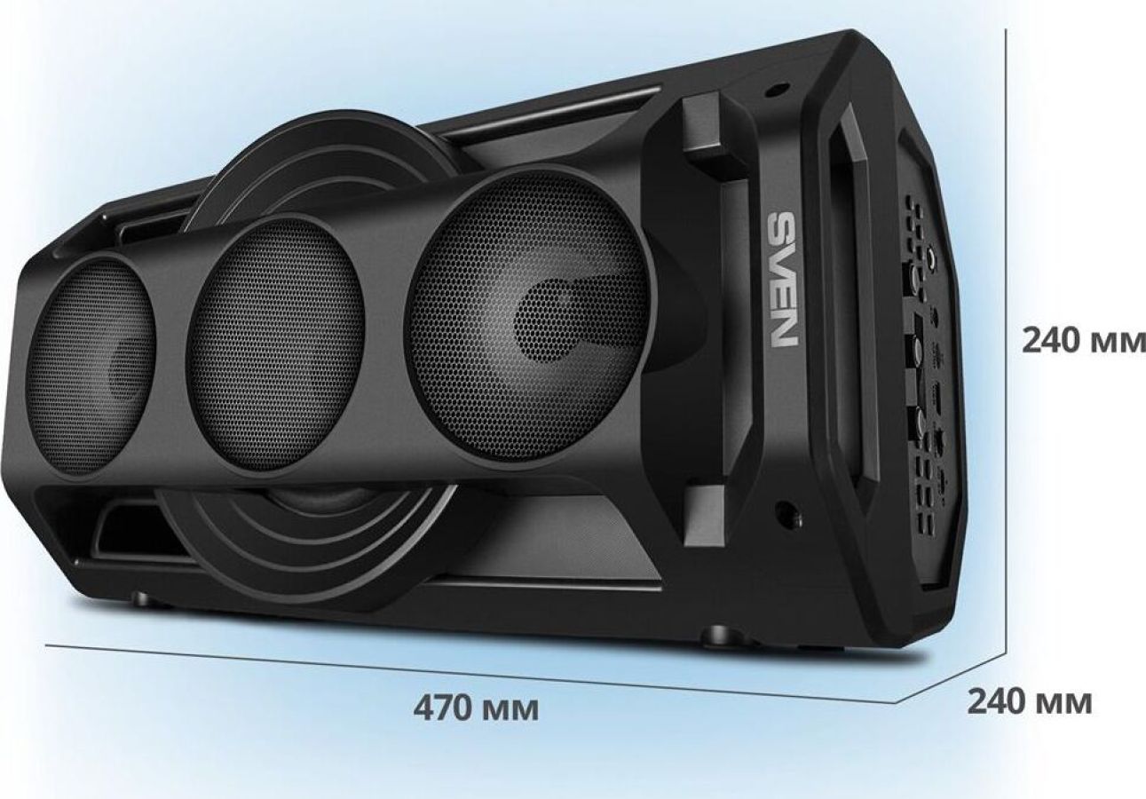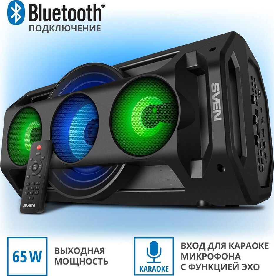 Многофункциональная портативная акустическая система с подсветкой, Bluetooth, LED-дисплей, встроенный эквалайзер, встроенное FM-радио, выходная мощность (RMS), Вт 65 (2 x 32.5), частотный диапазон, Гц 45 – 22 000, диапазон частот тюнера, МГц - 87.5 – 108, размеры динамиков, мм - ВЧ: O 70, НЧ: O 140, воспроизведение музыки с носителей памяти USB, microSD, источник питания литий-ионный aккумулятор: 4400 мA · час (2 шт.) / USB: DC 5 V, тип соединения Bluetooth, проводной, радиус действия, м - до 10, размеры изделия, мм 470 х 240 х 240, вес - 4,35 кг.