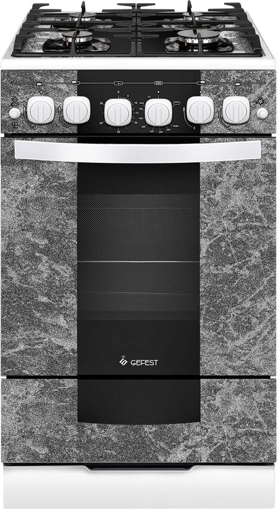 Габариты (ШхГхВ) 50х58,5х85 см. 4 газ. горелки. Электророзжиг горелок стола. Гриль горелка. Решетки горелок стола чугунные. Механический таймер. Полезный объём духовки: 52 л. Газ-контроль духовки. Вертел с электроприводом. Направляющие духовки: проволочные. Термоуказатель. Выдвижной ящик для посуды и принадлежностей. Без крышки. Фасад стеклянный с рисунком "мрамор", варочная поверхность: стеклянная.