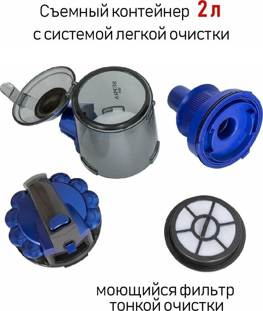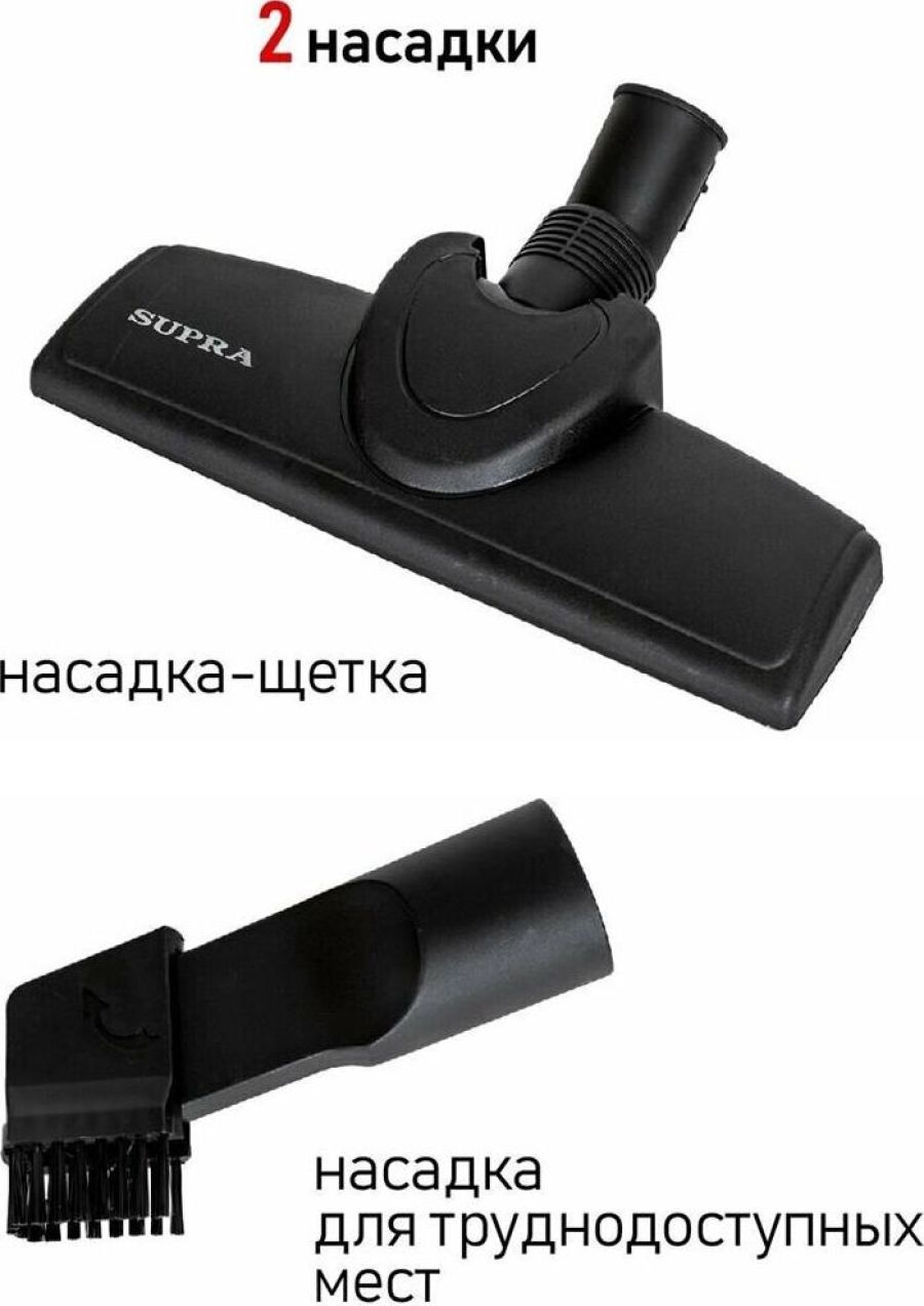 SUPRA VCS-1832 Тип традиционный пылесос Тип уборки сухая Дополнительные функции автоматическое сматывание шнура Тип пылесборника контейнер Объем пылесборника 2 л Потребляемая мощность 1800 Вт Мощность всасывания 360 Вт Фильтр тонкой очистки есть Труба всасывания составная Насадки в комплекте пол/ковёр; щелевая